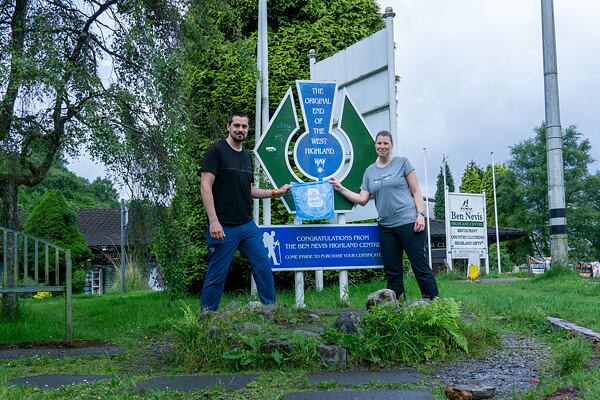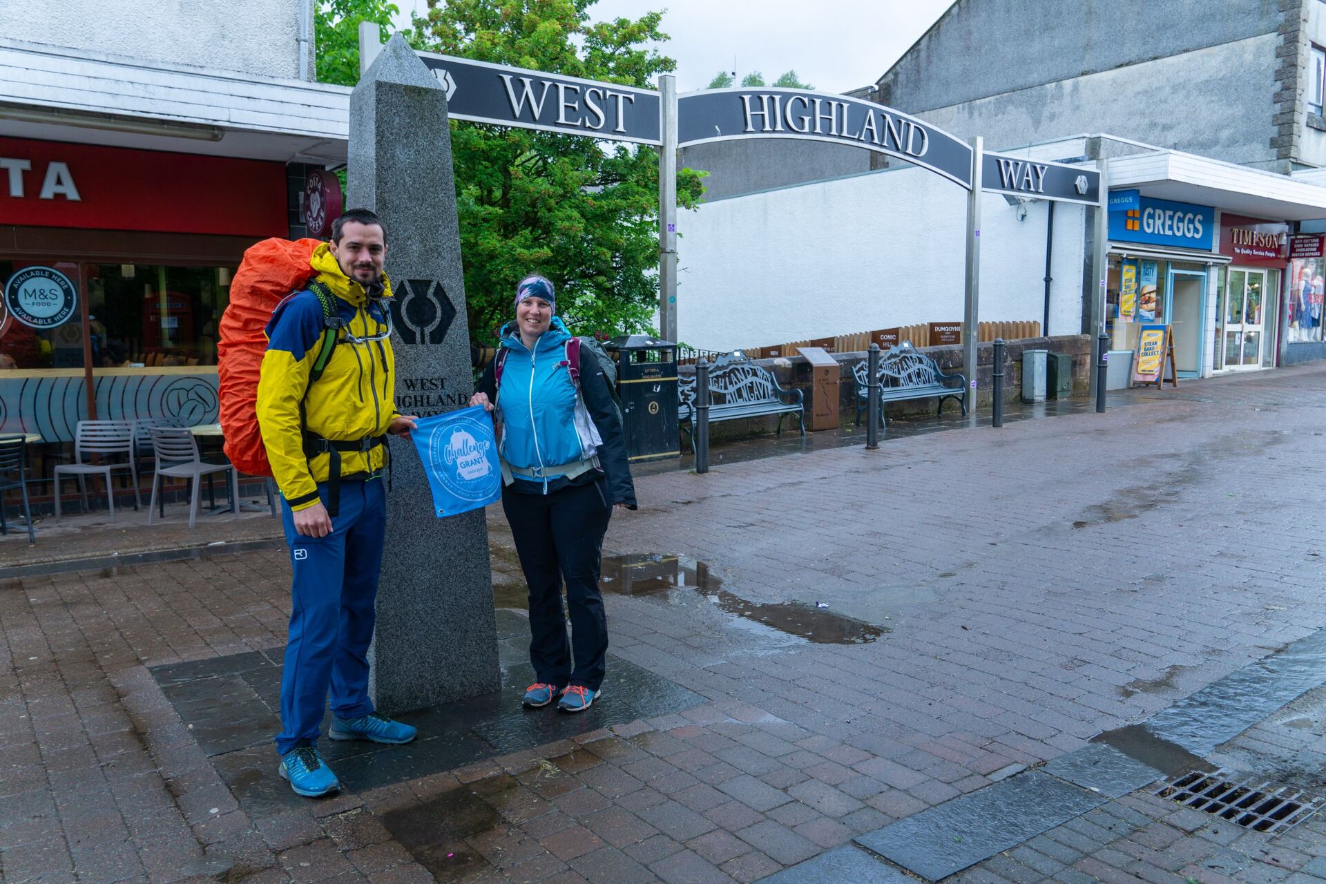 Vlakem se přesouváme do Glasgow a poté do Milngavie, kde je začátek dálkové trasy West Highland Way. Už ve vlaku potkáváme několik dvojic s velkými batohy. Nakonec se nás u obelisku označujícího začátek trailu schází asi pět dvojic a všichni se vzájemně fotíme.