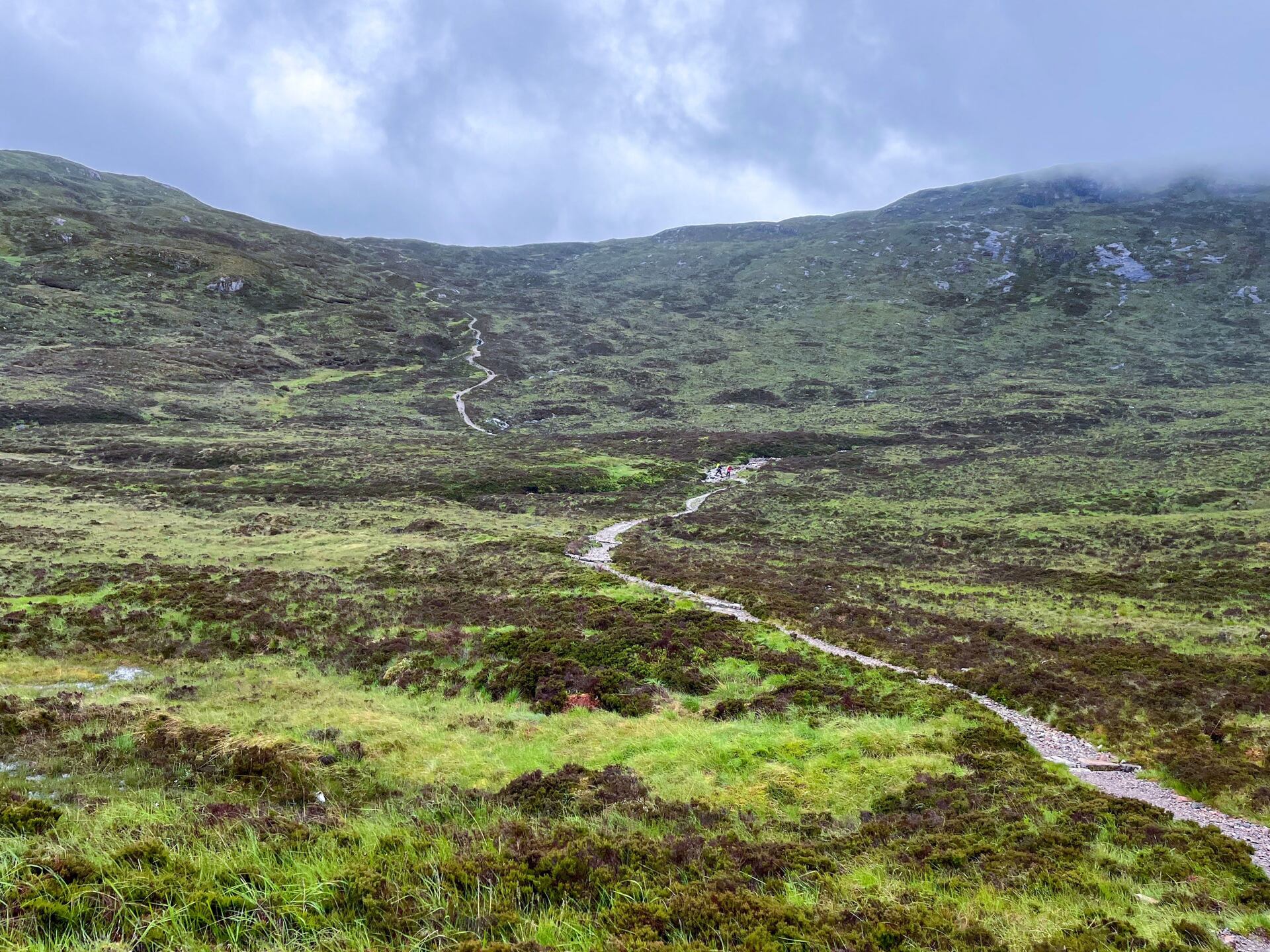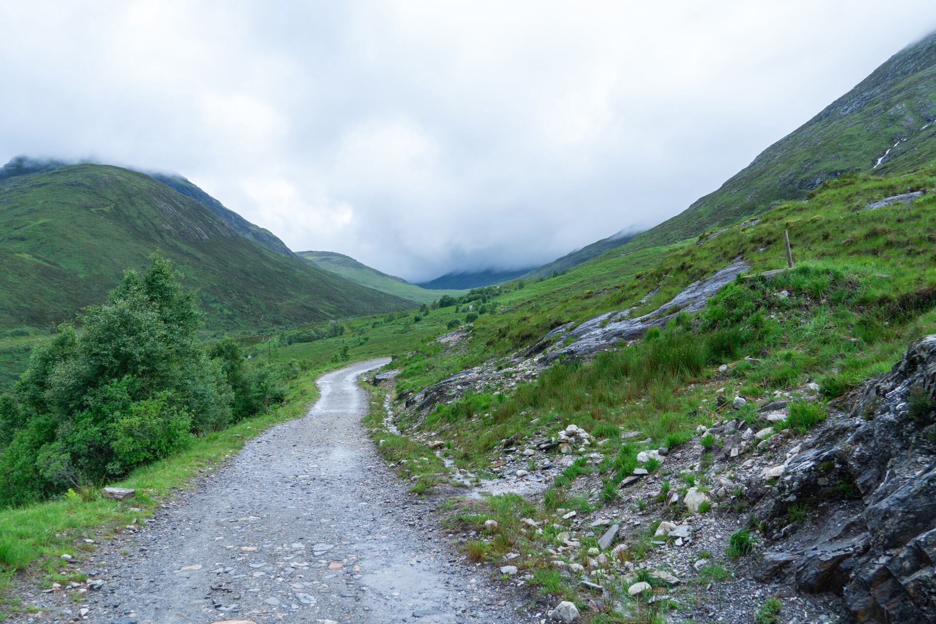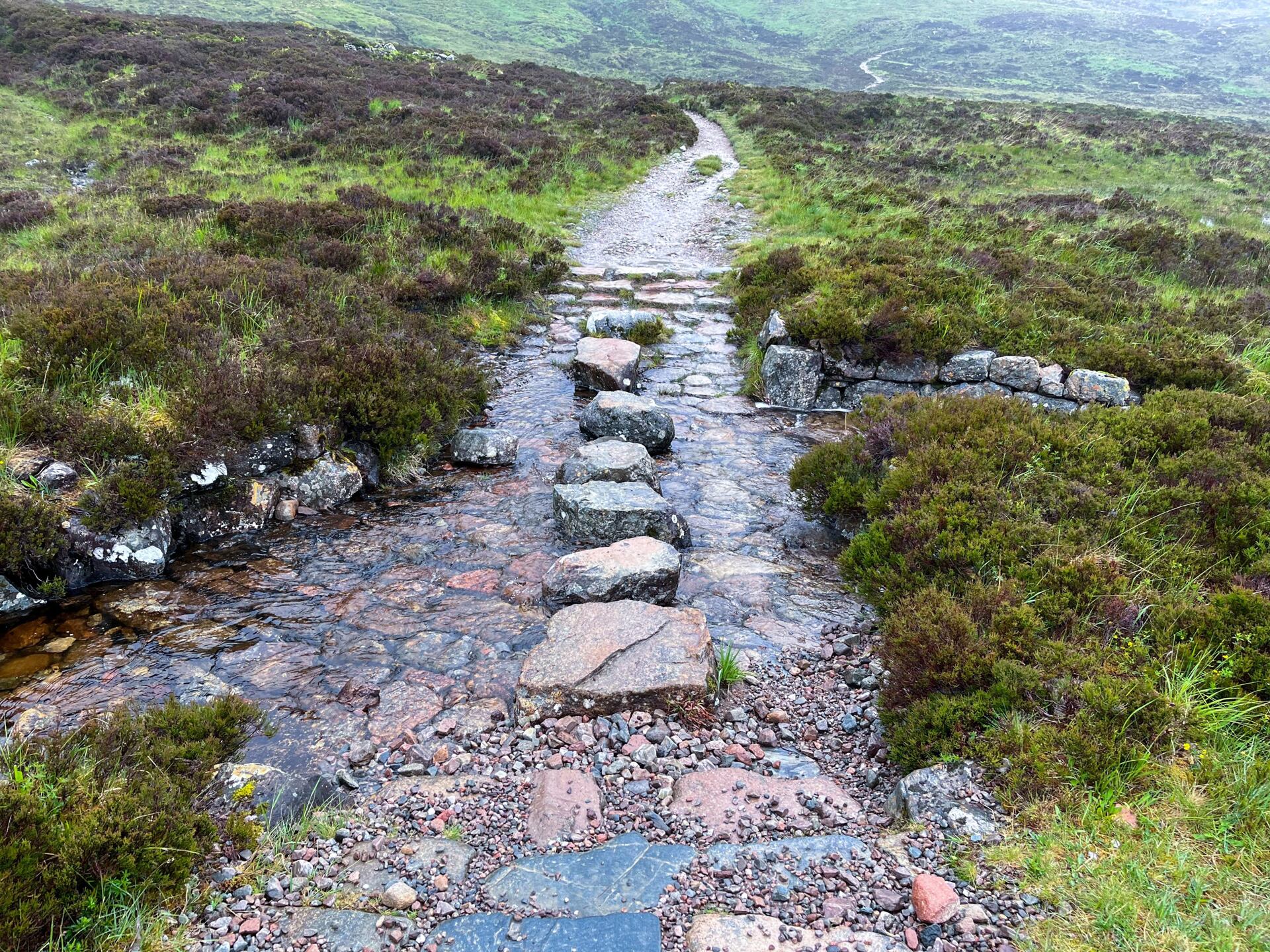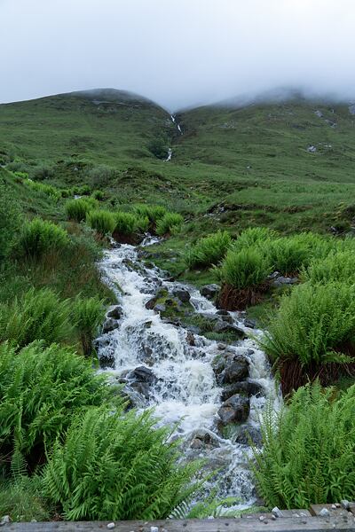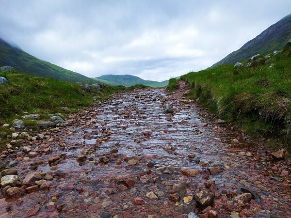 Ráno opět balíme mokrý stan. Už to začíná být trochu nepříjemné. Z Kinlochlevenu stoupáme přes hřeben do dalšího údolí. 36hodinový déšť způsobil, že z cesty se stal potok. Krásným údolím tak víceméně proskáčeme po kamenech. Celý dojem narušuje jen silný studený protivítr, ale když zasvítí slunce, je i docela teplo. Kocháme se krajinou a hledáme cestičky, kudy se dostat přes jednotlivé potoky a potůčky.