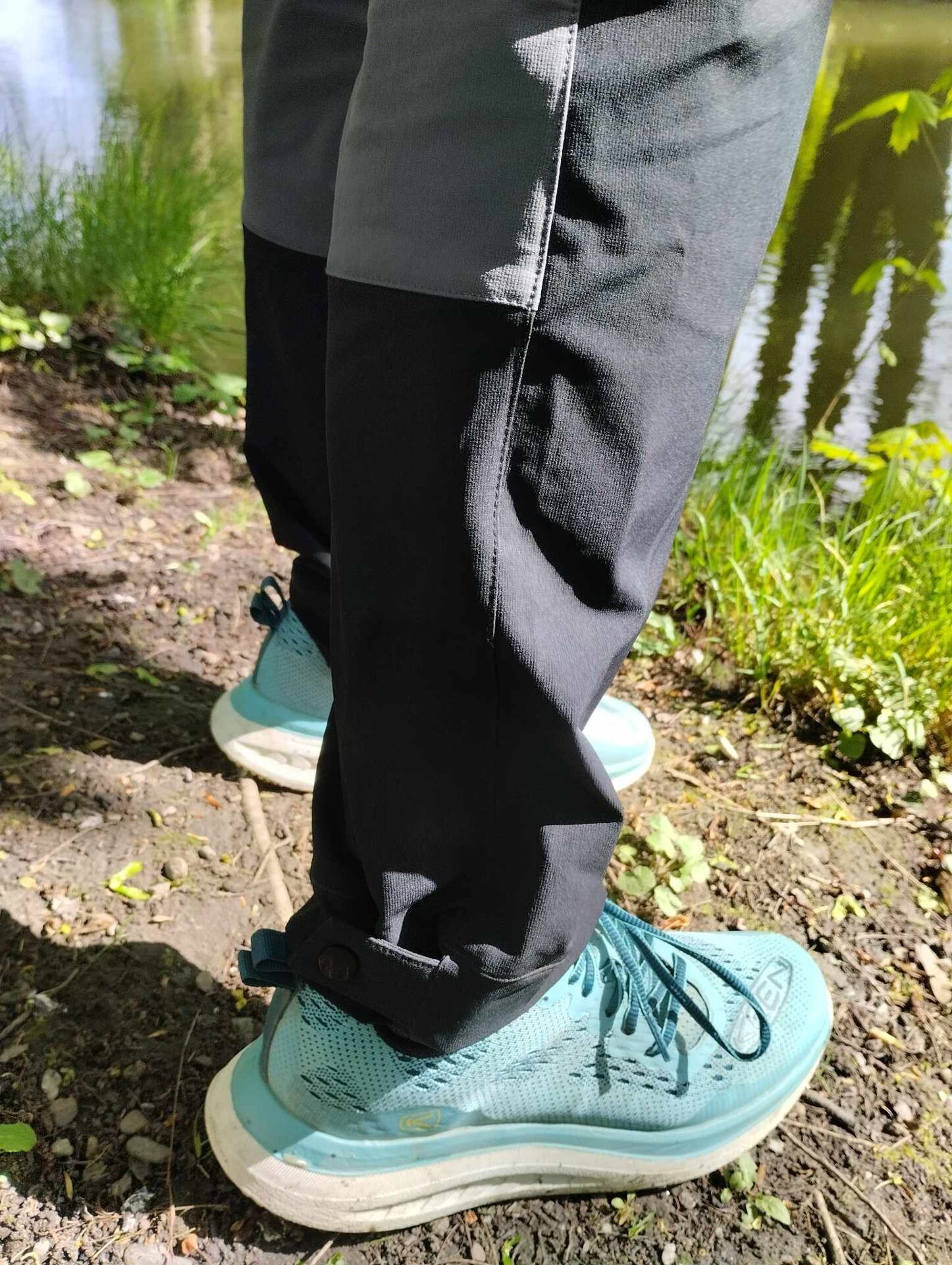 Zmínit musím také sponu opasku – je příjemně hladká na omak, dobře a snadno se s ní manipuluje. Chytře a jednoduše je řešený i spodek nohavice, místo gumiček nebo suchých zipů jsou zde dvě patentky – nohavice je buď široká, nebo ji lze zúžit, např. k fixaci kolem kotníkové boty.