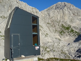 Západní svah Skuty byl úplně jiná liga, naprostá pohoda oproti tomu východnímu. K modernímu designovému Bivaku Pavla Kemperla už to byl jen kousíček, a byla to tam skvělá noc, úplně příkladně bivaková a komunitní – nějakým zázrakem jsme se tam sešli s Němcem, Italem, Rumunkou, Američankou a třemi Slovinkami.