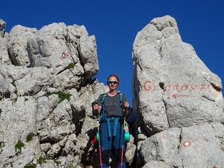 Devátý den pochodu nás čekal Grintovec (2 558 m. n. m.), nejvyšší hora Slovinska ležící mimo Julské Alpy. Vede na něj jedna cesta z jihu od Zoisovy koči, která je podle mapy nenáročná, a pak zajištěná ze severu. My jsme šli ze severu, protože se nám to víc hodilo do itineráře. Parádní výstup, užili jsme si ho, navíc jsme tam byli už o půl deváté ráno, takže skoro sami, a mohli jsme se kochat výhledy a krmit ptáky tyčinkami.