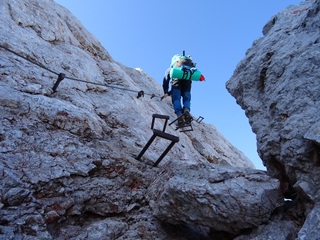 Výstup z Robanova kotu na Planinu na Korošici, který zespoda vypadal jako špatný vtip, nám dal celkem jasně najevo, že teď pár dnů hůlky nebudeme potřebovat. I když každé dílčí lano či úsek s železnými stupy se dal dobře zvládnout, délkou to bylo docela náročné. Sice jsme nemuseli řešit vyhýbání, protože jsme po celý výstup vůbec nikoho nepotkali, na druhé straně ta liduprázdnost tomu jaksi přidává na adrenalinu a vážnosti. Kam to proboha lezeme, že tam nikdo jiný nejde?!