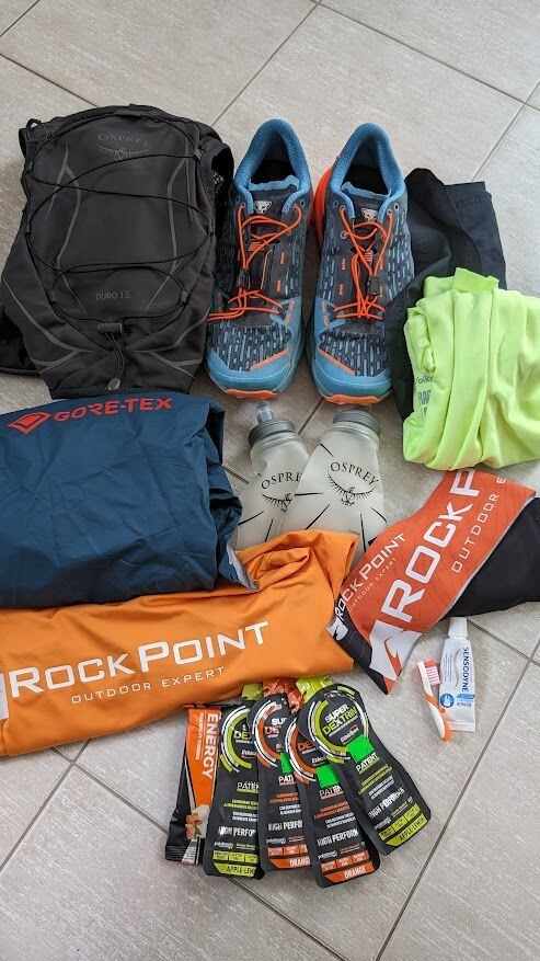 Při těchto bězích je důležité vybavení, na které se člověk může spolehnout. Takže základem jsou dobré boty, kraťasy a výborná bunda a běžecký baťůžek na vodu a pár dalších věcí, které jsem nesl. Nic nesmí nikde dřít ani nijak překážet. Ono i jen cinkání pár drobných, které jsem měl, dovede po pár hodinách běhu docela zkazit náladu. Ne všude brali karty.