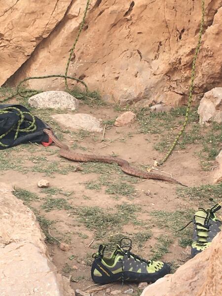 O hadech jsme věděli, ale očekávali jsme je až při výstupu na Jebel Sirwa. Nicméně si tak lezu, vlastně už jsem spouštěn po úspěšném zdolání nějaké šestky, když najednou Klárka zařvala, jako by jí spadnul kámen na hlavu. Úplně ve mně zatrnulo.