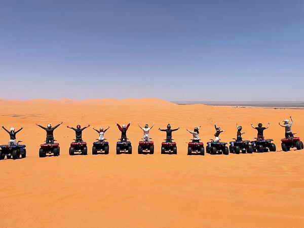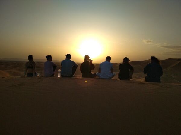 Od rána nám okolo hotýlku svištěly čtyřkolky. My jsme měli v plánu jen velbloudy. Dvě minuty debaty a bylo jasno. Na čtyřkolkách to byl super adrenalin a myslím že i vydařený teambuilding pro nově vznikající partu super lidí. Po čtyřkolkách jsme se šli povozit na velbloudech – půlhodinka a stačilo nám. Večer jsme jeli do malého kempu v poušti, koukali na západ slunce na dunách, dali si super jídlo a v noci jsme bubnovali s místňákama. Príma den.