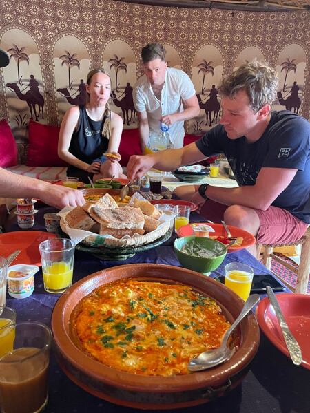 V Maroku člověk na výletě asi moc nezhubne. Dávali jsme si pozor na dvě věci. Voda a vajíčka. Vejce tam skladují skoro na přímém marockém slunci. No a voda v Africe, to je nebezpečná zbraň. Každopádně vajíčkům jsme odolávali celý jeden den. Na snídani v poušti už si někteří odvážlivci dali. Tuším, že nejpozději pátý den už to neřešil nikdo. Na vodu jsme si ale dávali hodně pozor. Já jednu nepříjemnou zkušenost z Egypta mám a nechtěl jsem to podcenit.