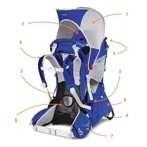 1 - Clona proti slunci s UV 50+ 2 - Měkké odvětrávané sedátko pro max. pohodlí 3 - Třmeny na podpěru nohou 4 - Prodyšné ramenní popruhy 5 - Integrovaný malý „batůžek“ na drobnosti 6 - Stabilní konstrukce, možnost složení 7 - Bederní pás s kapsou 8 - Výškově nastavitelný zádový systém Air Speed™ 9 - Velký prostor na věci