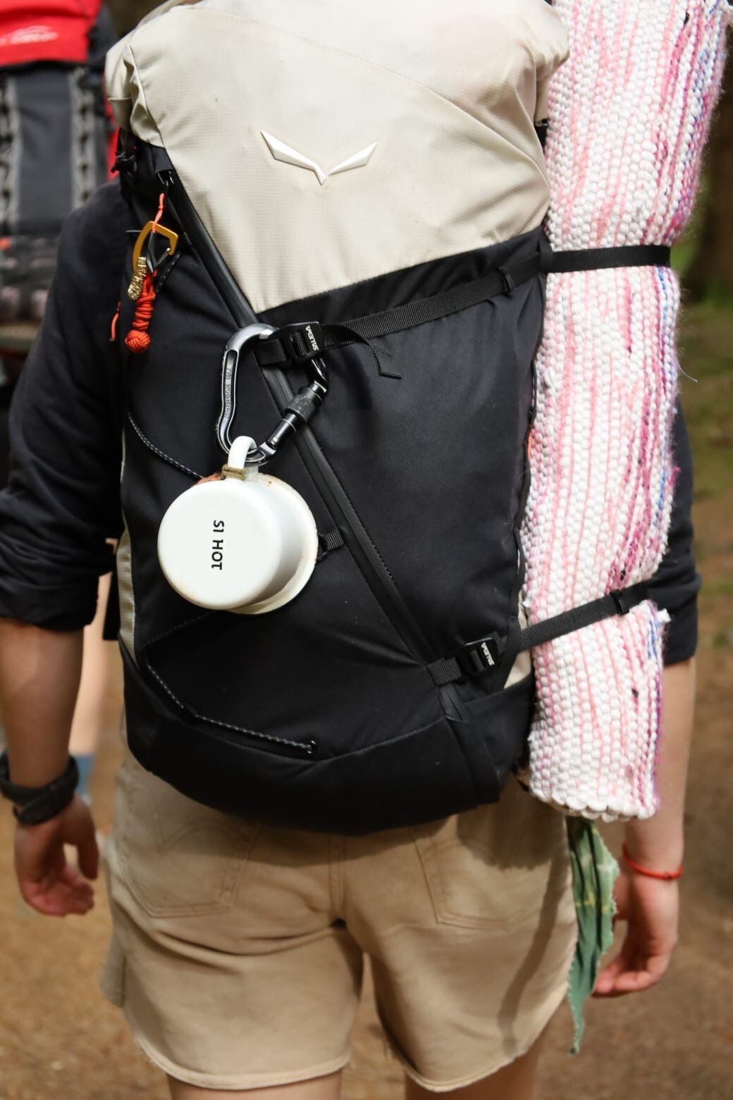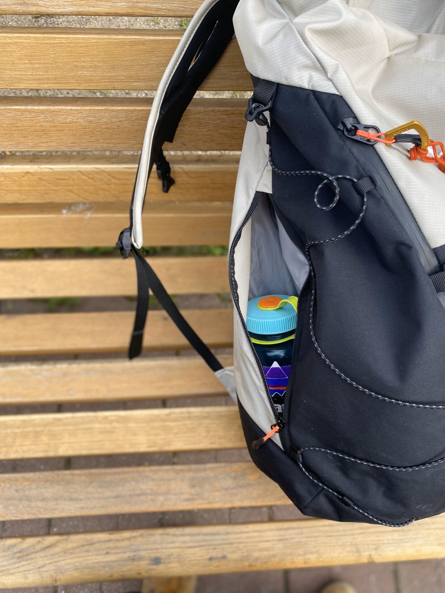 Další praktickou věcí, co jsem na batohu velmi ocenila byla postranní kapsa na telefon, který z ní jde vyndat velmi pohodlně. Na druhém boku batohu se nachází dle mého názoru méně praktická zavíratelná kapsa na láhev. Když jsem batoh neměla plný, kapsa přišla vhod. Při delších trecích, kdy jsem potřebovala každé místečko v batohu, mi láhev ubírala část hlavní komory a bylo lepší ji připnout zvenku karabinou, kterou jsem dala do jednoho z materiálových oček, která jsou podél pravého boku.