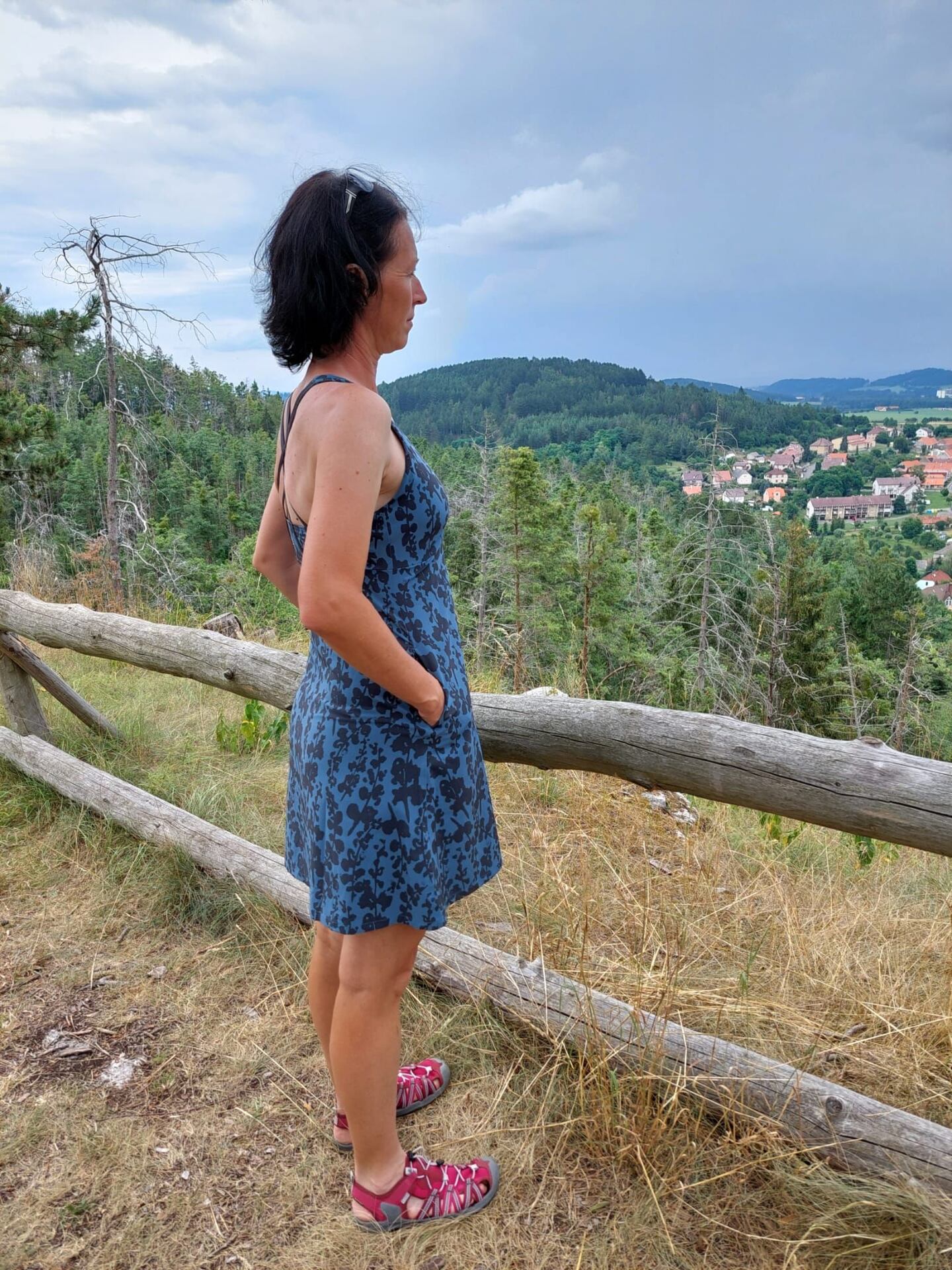 Výhodou těchto šatů je i to, že si je můžete vzít, kam se vám zlíbí. Je jedno, jestli jdete do města, posedět s kamarády anebo jestli v nich vyrážíte na výlety jako já. Neomezují vás v pohybu a můžete v nich dělat i opravdu dlouhé kroky, což oceníte, pokud jdete do velkého kopce terénem. Na Šumavě toho se mnou zažily dost.