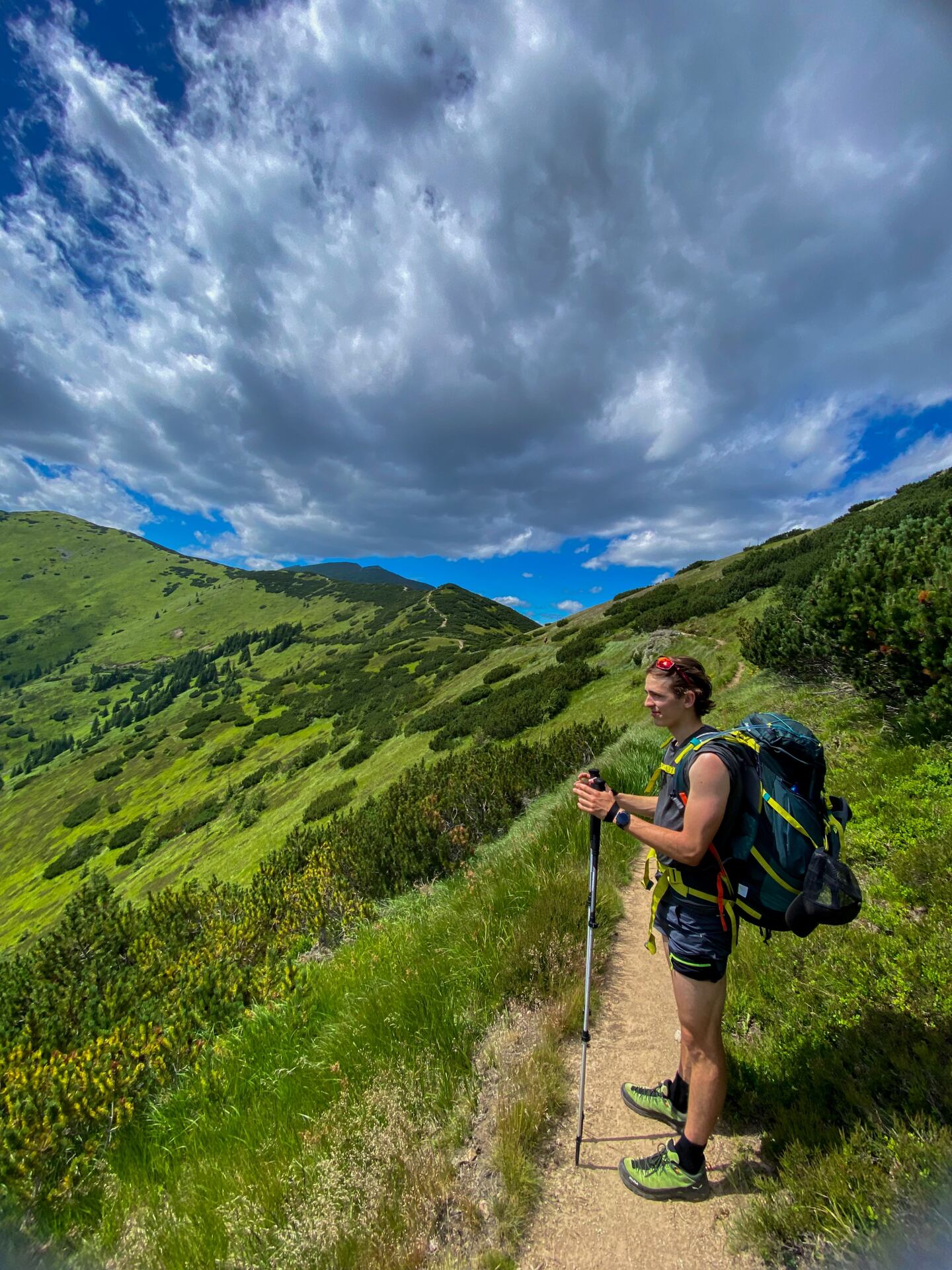 První půlka dne je moc fajn – náročná, ale s krásnými výhledy – hurá! Druhá půlka se ukazuje celkem na prd. Prodíráme se roštím, neustále přelézáme popadané stromy, a dokonce mě i Áďu potkává první pád. Naštěstí končí jen odřeninami, ale cesta je v tomhle úseku tak prorostlá, že vůbec nevidíme, kam šlapeme a je snadné šlápnout „mimo“.