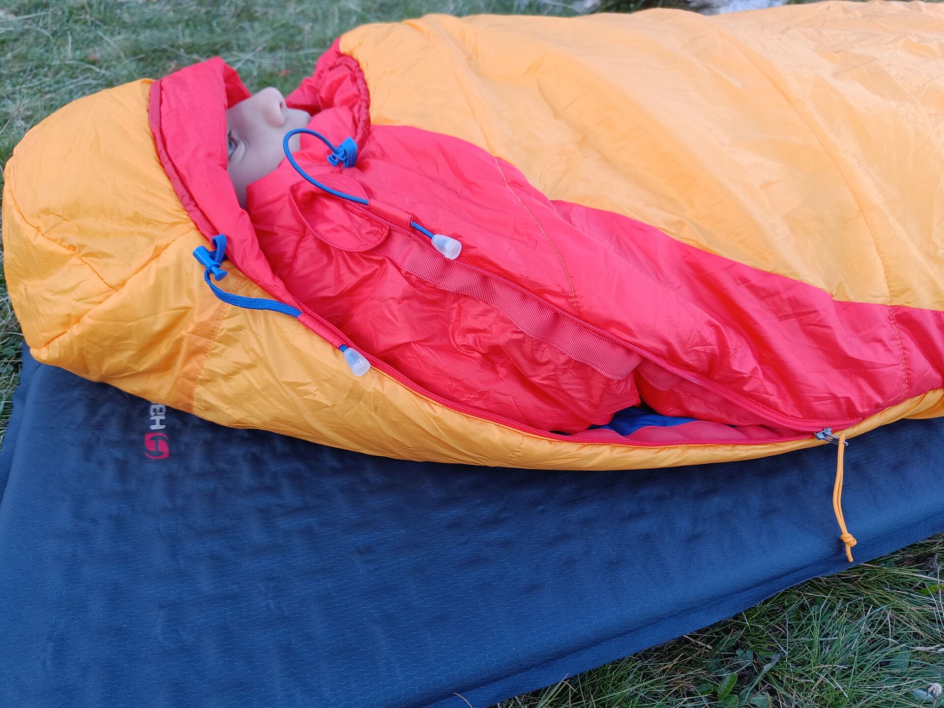 Začnu precizně tvarovanou kapucí, kterou lze bezproblémovým stažením kolem hlavy i pod bradou dokonale nastavit tak, že ze spacáku může koukat pouze nos.