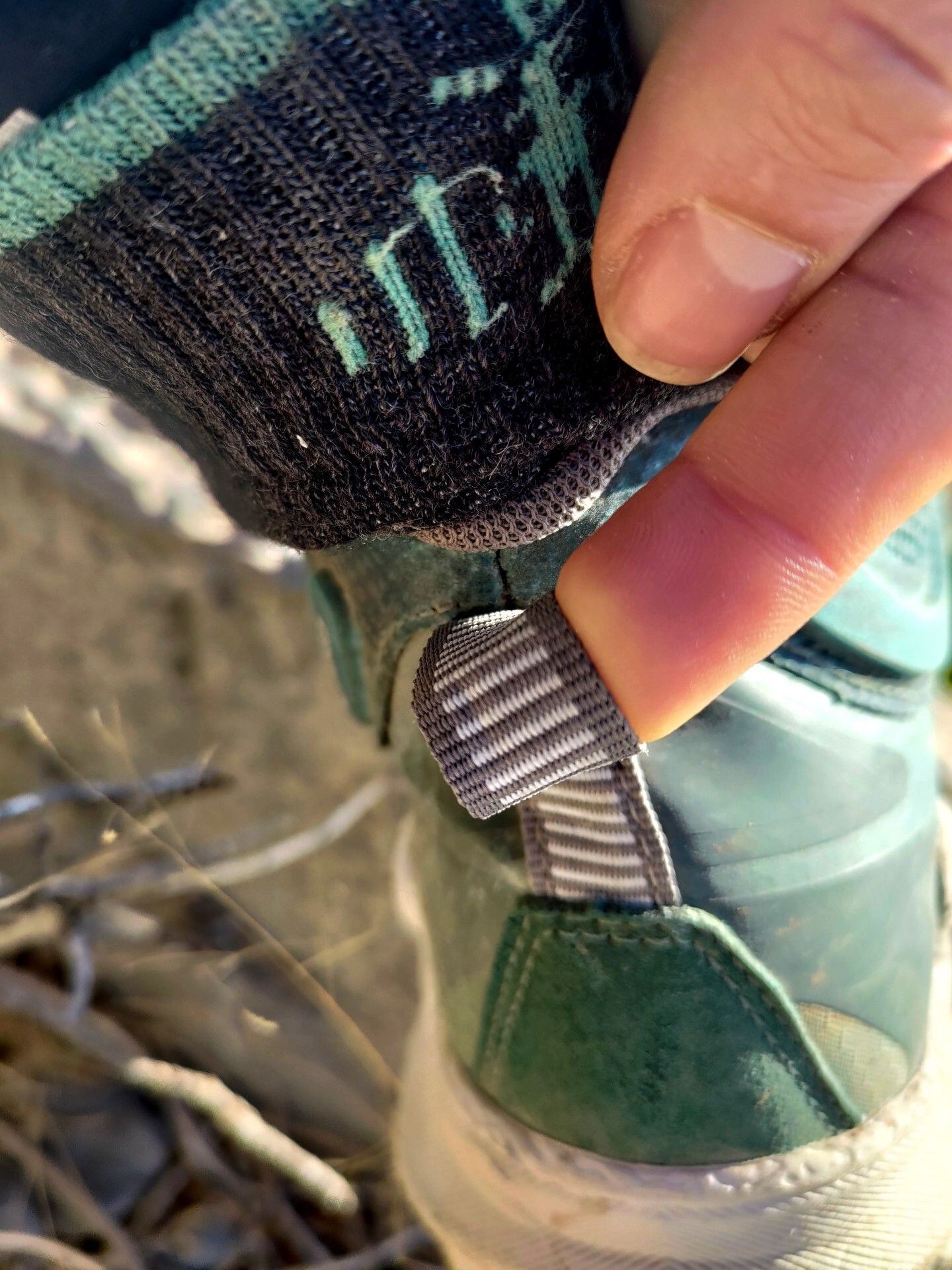V oblasti paty se nachází textilní poutko usnadňující nazouvání a vyzouvání a umožňující boty v případě potřeby zavěsit např. na karabinu na batoh.