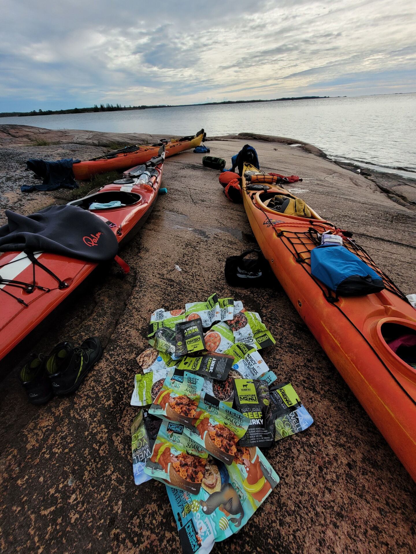 Většina věcí je rozstrkaná po kajaku v různě velkých nepromokavých vacích. Za ně naše expedice děkuje Rock Pointu, vaky od značky Osprey se fakt osvědčily a vydržely i hrubé zacházení. Akorát se do kajaku vejde o hodně víc věcí a tak máte nutkání si sbalit i pár zbytečností. Jako dřívkový vařič s mřížkou na grilování, hamaku, velký plyšový polštář, polštář s paměťovou pěnou. Kilo a půl zrnkové kávy. Myslím, že každý měl nějakou libůstku, kterou by s sebou v batohu nechtěl vláčet. Oblíbená věta: Kajak to uveze (smích).