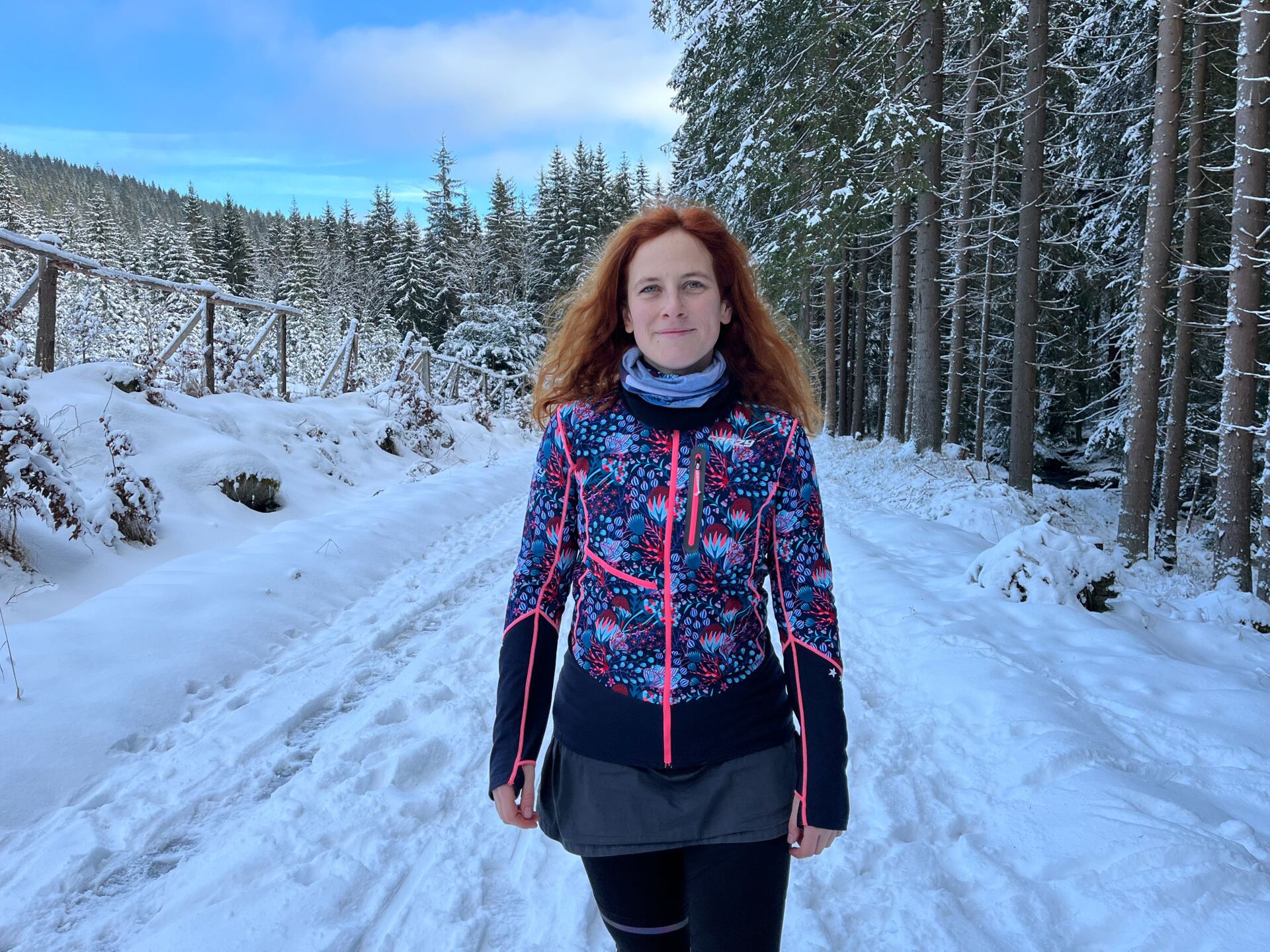 Bylo tedy načase podrobit tenhle designový kousek trochu obtížnějším podmínkám –dogtrekkingová túra s běžeckými úseky ze zasněžených Abertam, noční skijöring v hustém sněžení na Božím Daru, výšlap hlubokým sněhem z Nových Hamrů. Zkrátka takové aktivity, na které je v zimě dost pracné se správné obléct, protože se buď zpotíte už v prvních metrech stoupání, nebo začnete mrznout hned, jak trochu zpomalíte. Vzhledem k tomu, jak jeCrazy mikina lehká a tenká, měla jsem strach spíš z druhé varianty a přihodila do batohu pro jistotu triko navíc.
