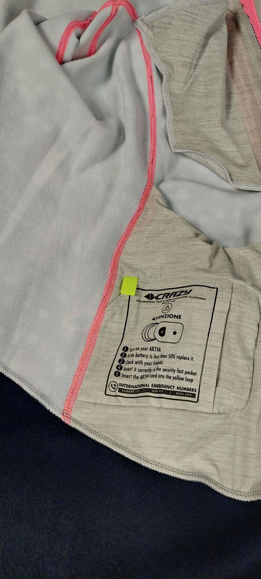 První, co mě napadlo, když jsem mikinu vybalila, bylo, že produktový obrázek jí moc nelichotí. Mikina totiž v reálu vypadá podstatně lépe než na internetu a hlavně barvy jsou mnohem víc zářivé. Mikina je tenká a lehoučká, počesaný fleece zevnitř příjemný na omak. Z vnitřní strany je kapsa s označením ARTVA – sem můžete bezpečně umístit lavinový vyhledávač. Není pochyb, že v Crazy počítali s tím, že v téhlemikině můžete vyrazit do těch nejobtížnějších terénů.
