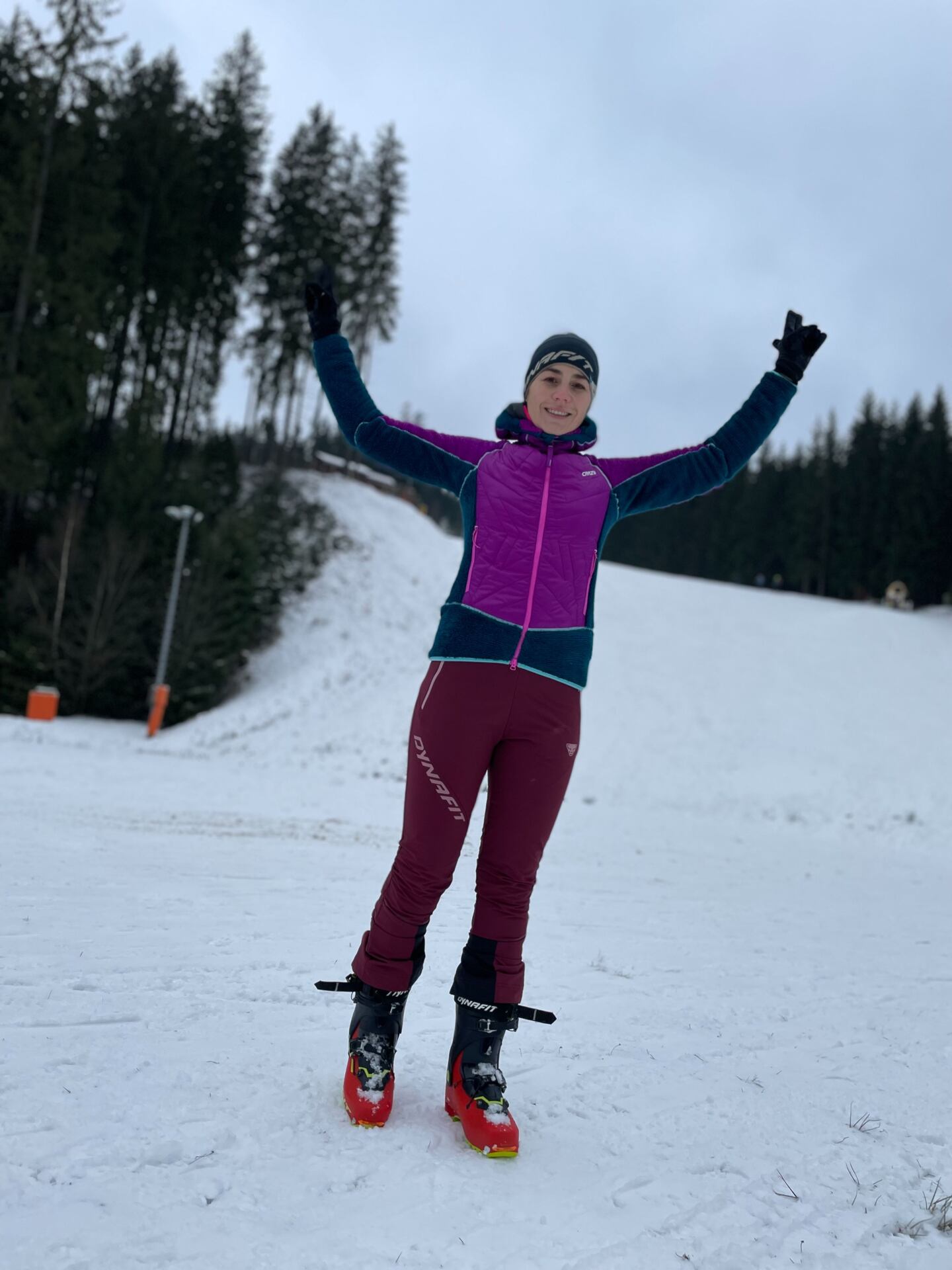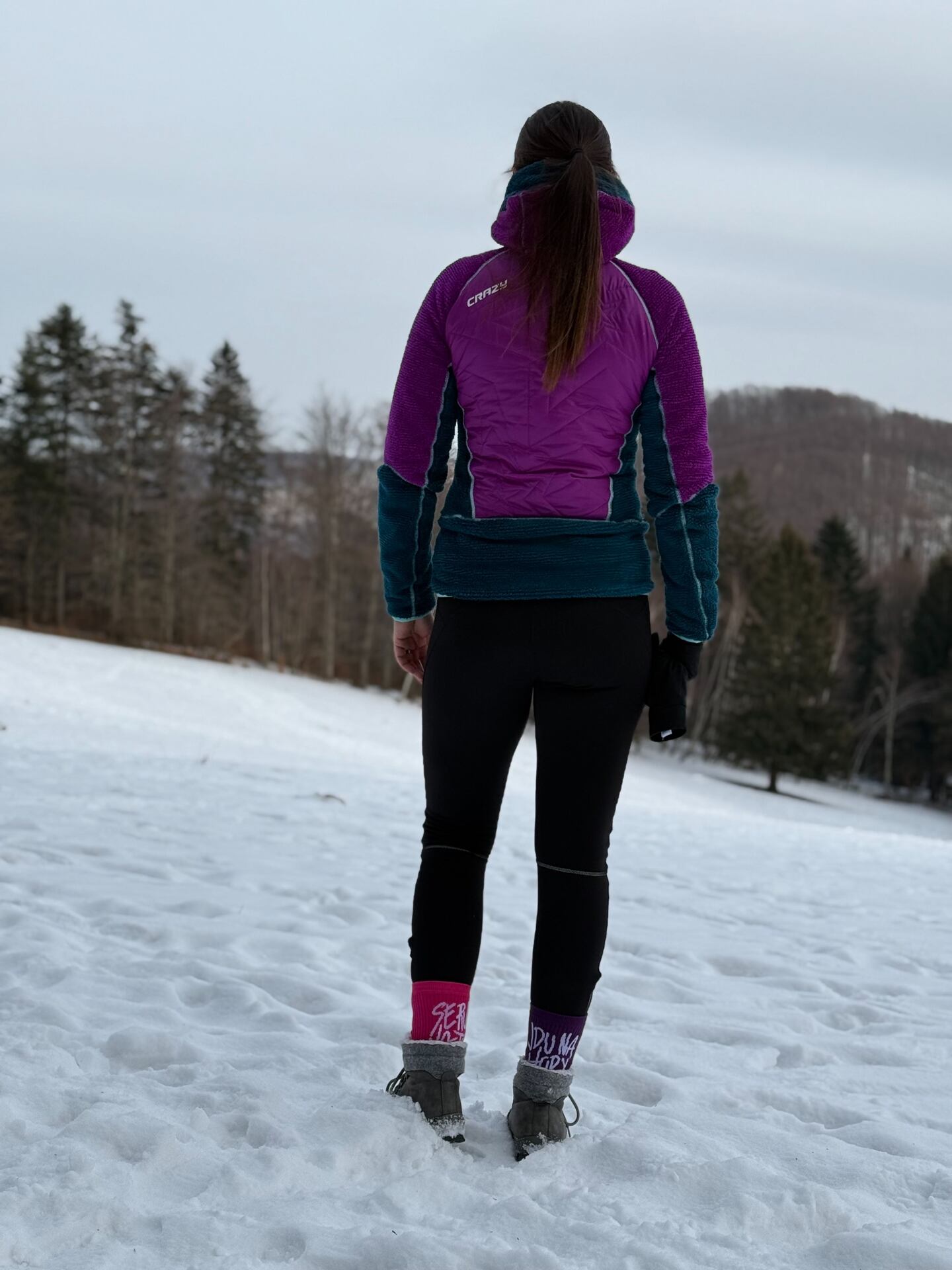 Při turistice jsem přemýšlela, jak se vhodně obléct. Měla jsem trochu strach, aby mi nebyla zima. Přeci jen na skialpech je člověk více aktivní. Navíc bylo zrovna trochu chladněji, kolem −2 °C a foukal studený vítr. Vzala jsem na sebe tedy opět funkční triko, funkční tenkou mikinu a tuhle bundu jako třetí vrstvu (v batohu jsem měla v záloze pro jistotu péřovku) a stačilo to.