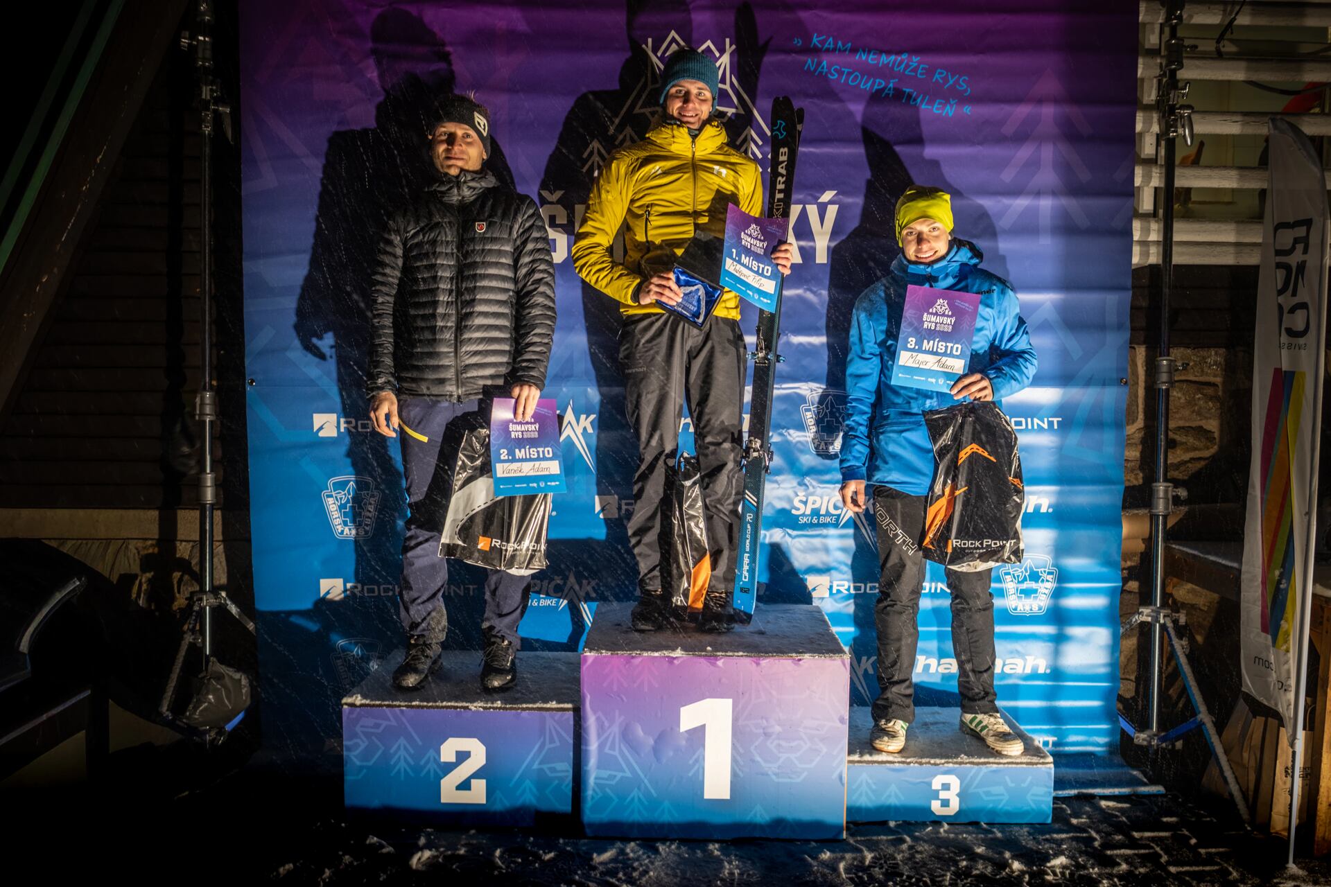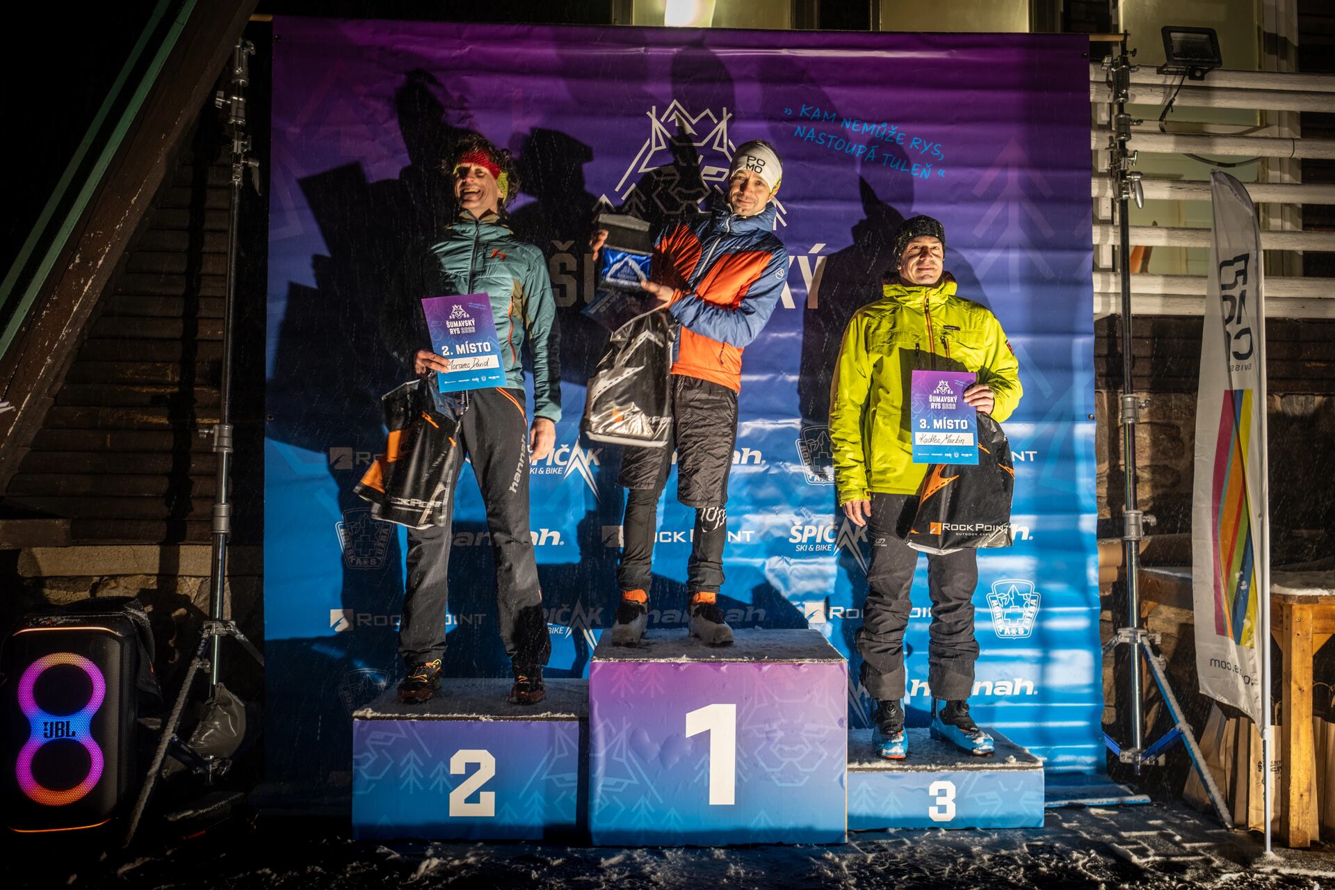 Vítězové závodu Šumavský rys 2026 v kategorii do 40 let: Filip Matějovič (1. místo), Adam Vaněk (2. místo), Majer Adam (3. místo)