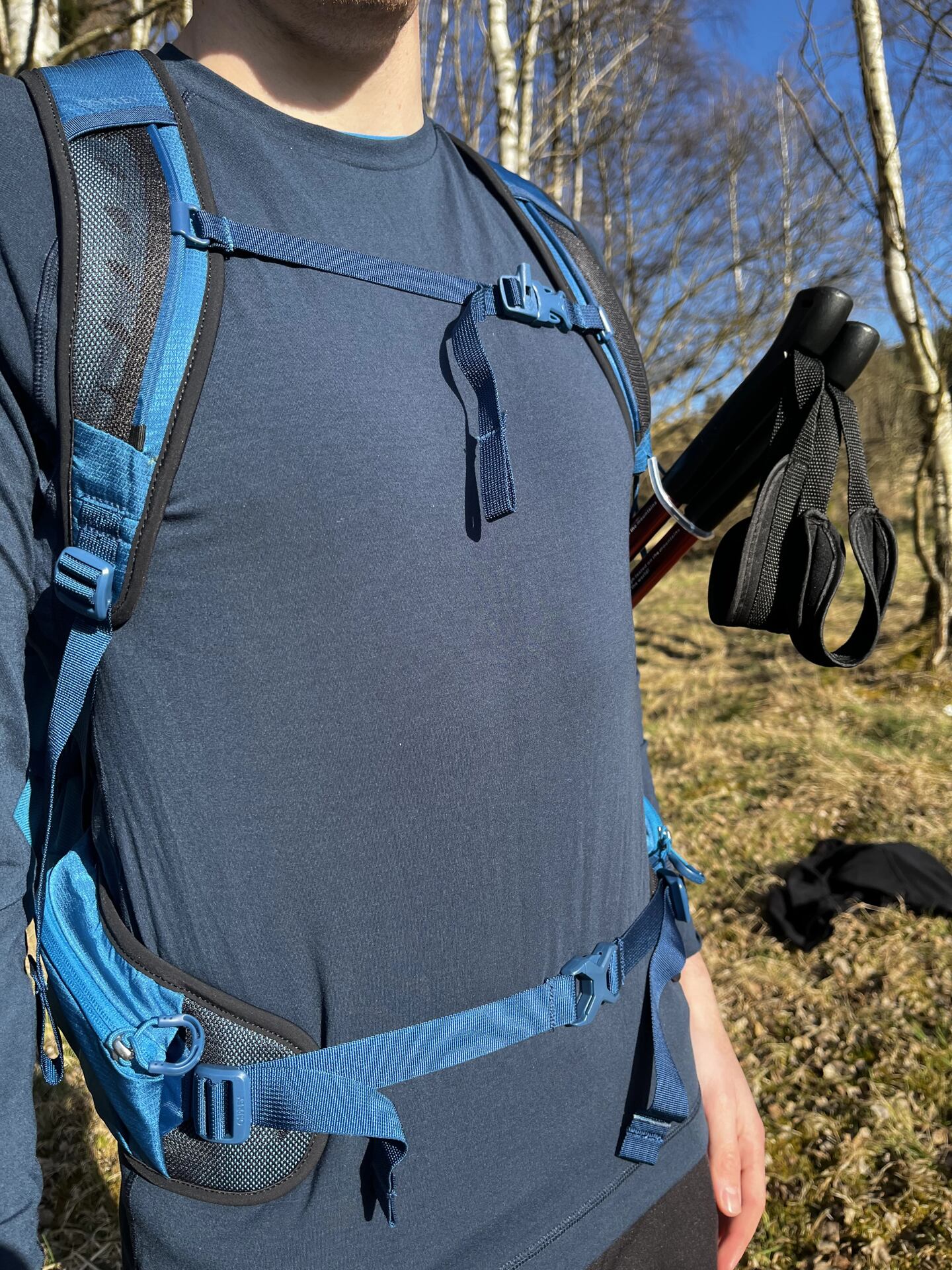 Ramenní popruhy a bederní pás jsou anatomicky tvarované, což zaručuje pohodlí i při delších výpravách. Bederní pás je měkký, pružný a tvarovaný tak, aby netlačil, dobře seděl na bocích, a hlavně odlehčil ramenům. Přizpůsobí se pohybu těla, takže jsem nepocítil omezení při chůzi ani běhu. Má také dvě kapsy na zip, kam se vejdou drobnosti jako klíče, svačina či mobil. Píšťalka na hrudním popruhu se v případě potřeby může hodit.