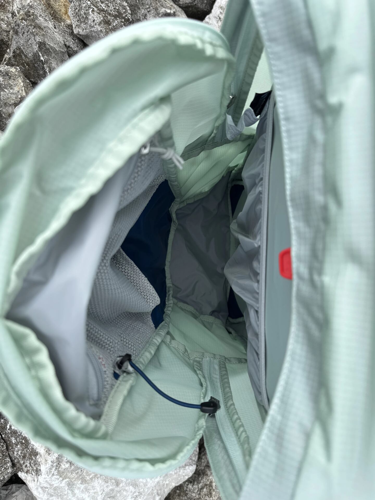 Další fajn detail je úchyt na cepín/trekové hole Stow-on-the-Go™, který umožňuje připnutí holí bez nutnosti batoh sundávat, což se hodí hlavně při střídání stoupání a rovinek.