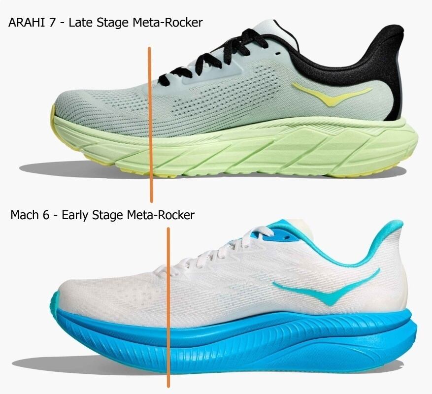 Early Stage Meta-Rocker Zaoblení začíná pod bříšky prstů, což urychluje přechod z paty na špičku a podporuje rychlejší, dynamičtější běh. Používá se u výkonnostních a závodních modelů.