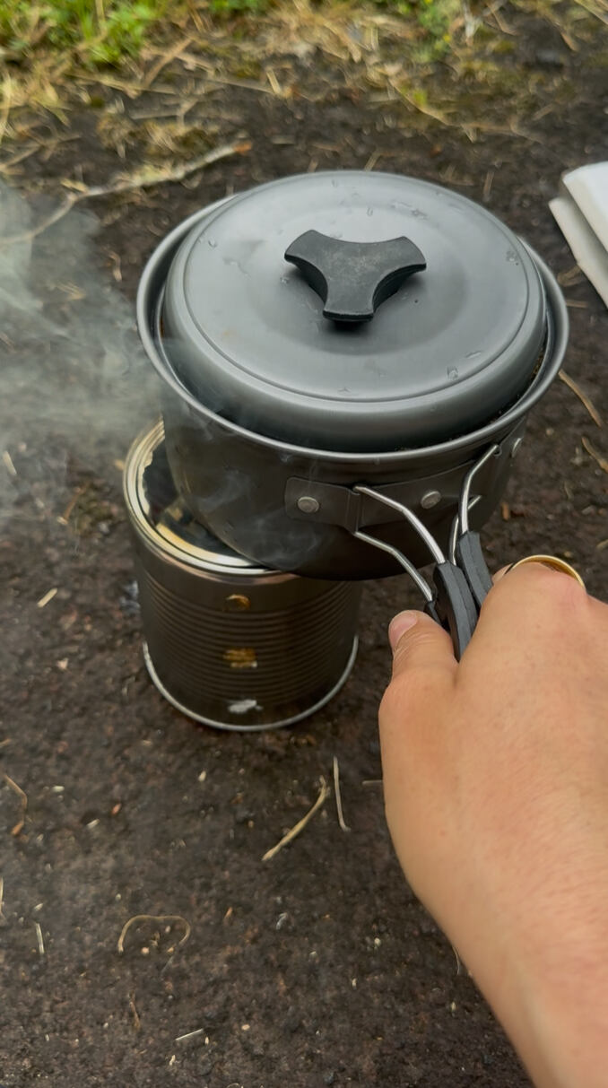 Jak vyřešit situaci, kdy vám chybí vařič? Kolega Adam mi poradil koupit PE-PO a plechovku. Takže jsem si uvařila vodu tak, že jsem zapálila PE-PO a dala na něj plechovku s dírama nahoře. Nic extra to nebylo, ale aspoň něco! V jednom kempu jsem pak shodou náhod našla šroubovací kartuši, co tam někdo nechal. Dělává se to tam často, protože v letadle si ji neodvezete.