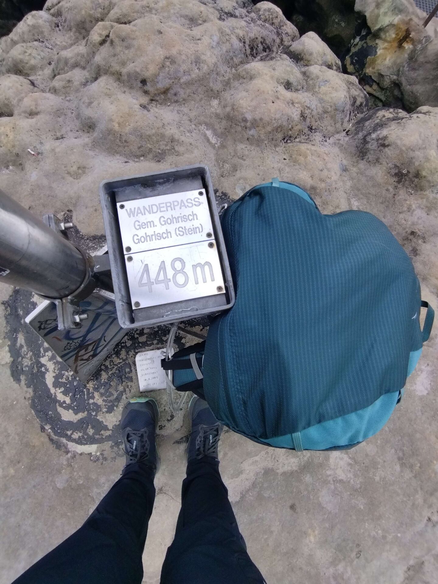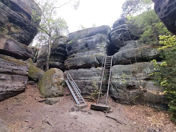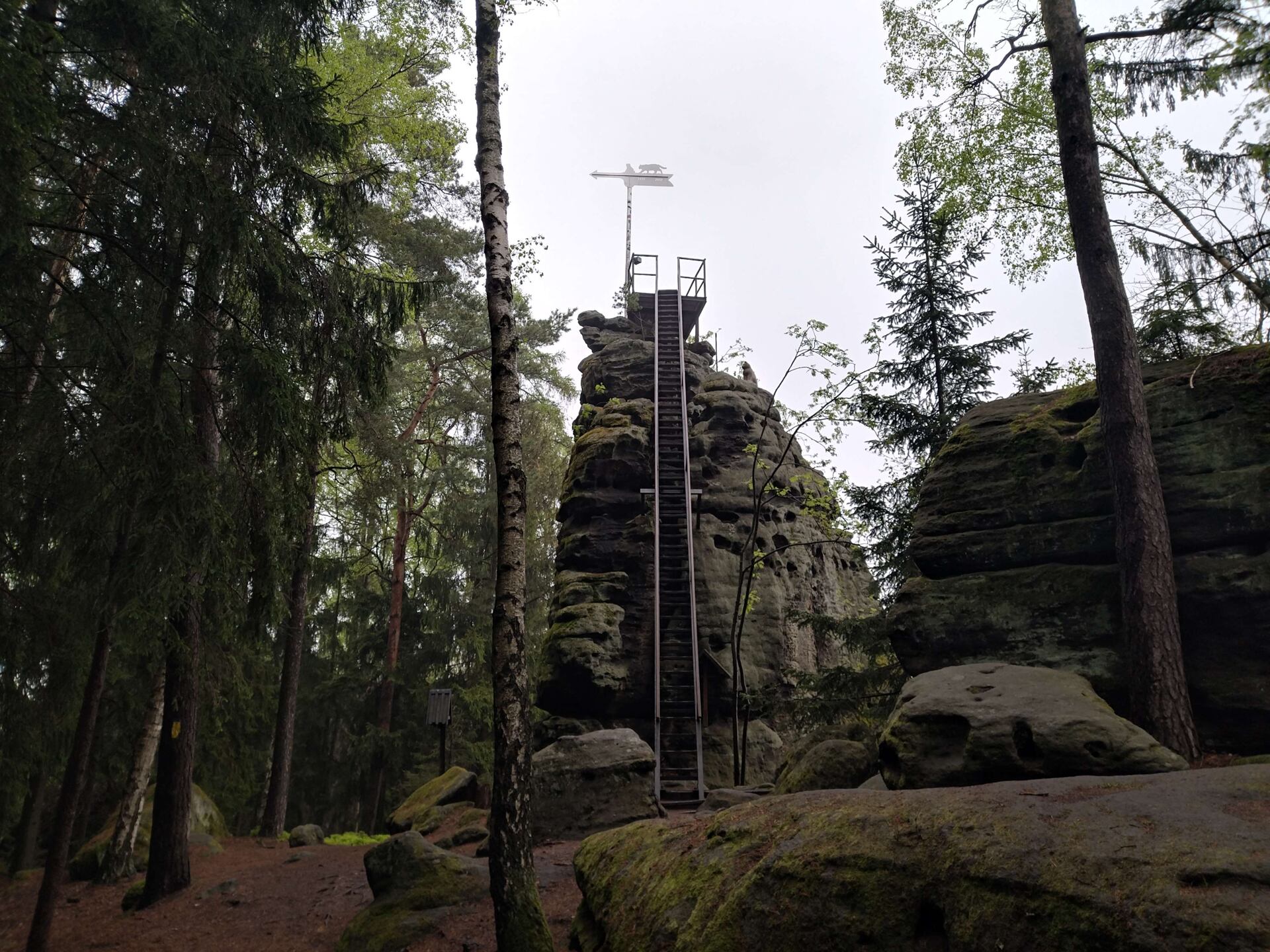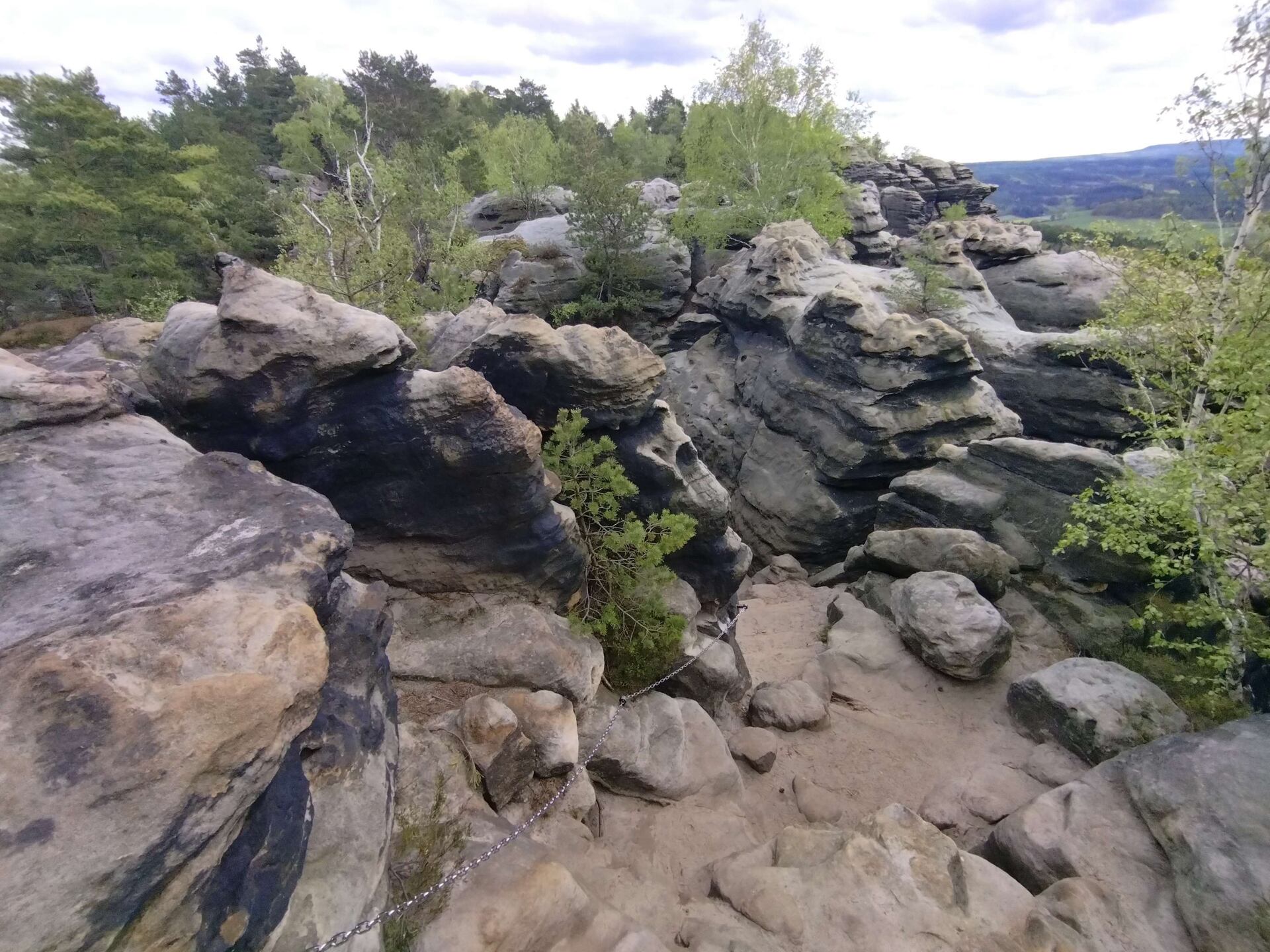 Třetí kopec Gohrisch (439 m) je rozlohou nejmenší, ale zato nejlepší prolézačka s úzkými skalními průchody a žebříky nahoru i dolů. S velkým batohem docela zábava. Pak už mě čekaly jen lesní cesty až na kraj vesničky Nikolsdorf do prvního bivaku.
