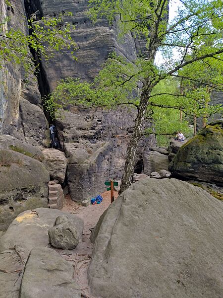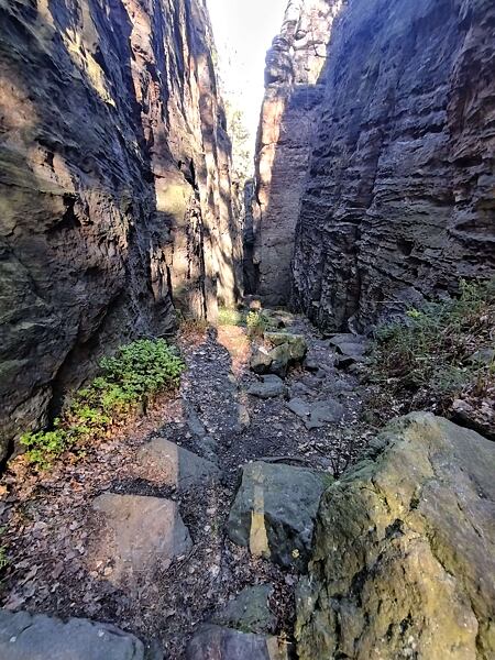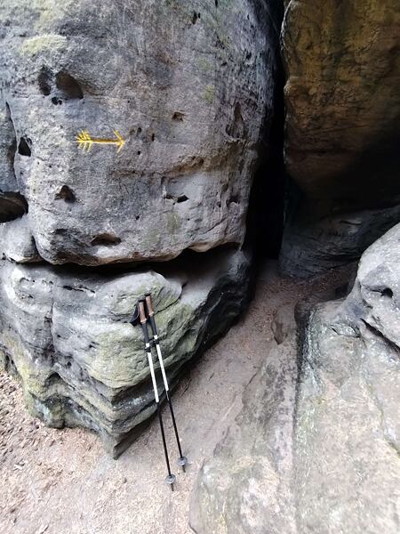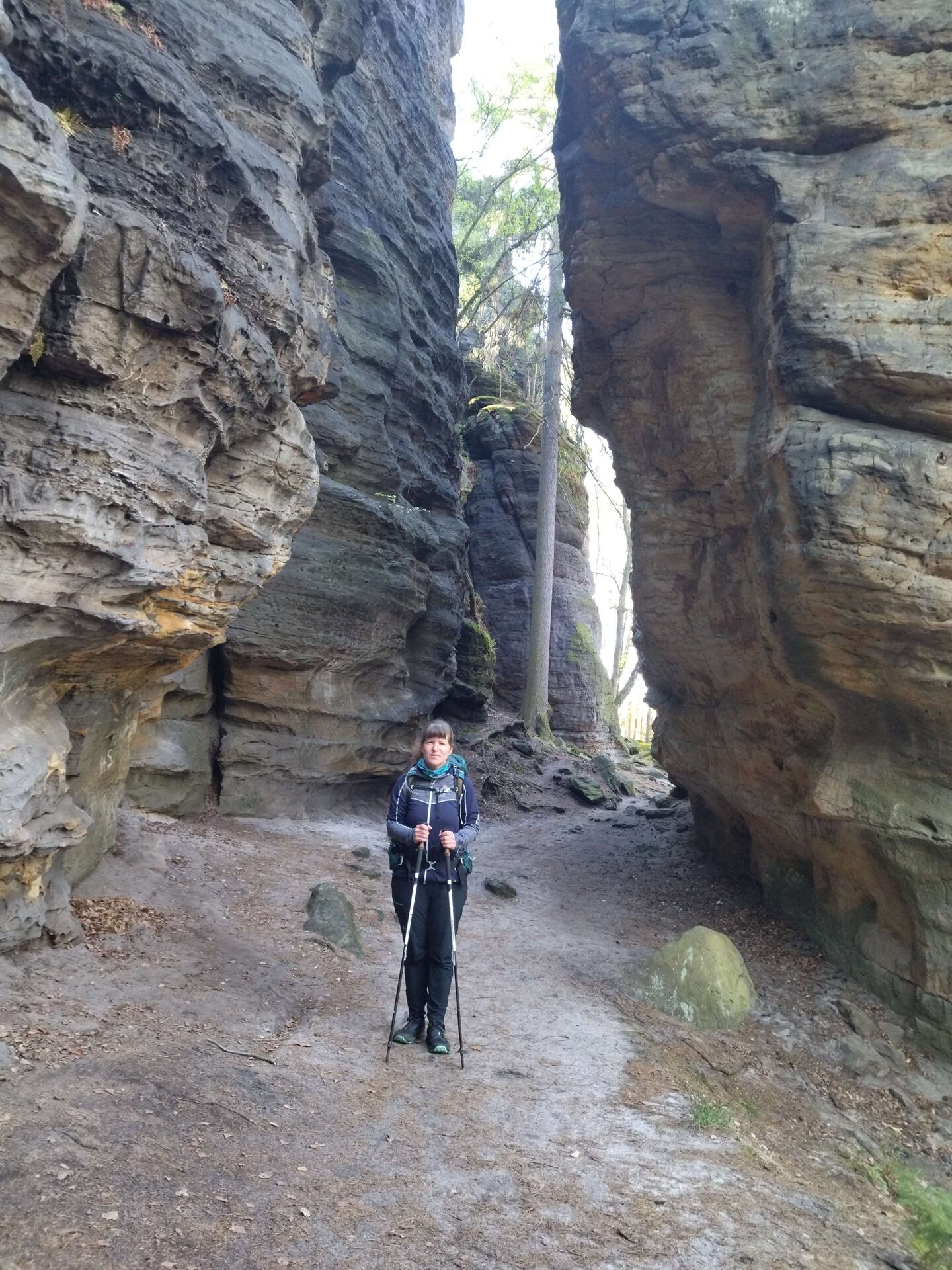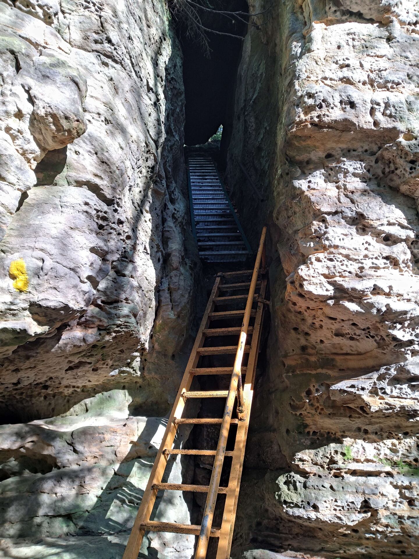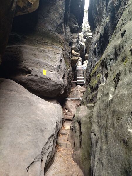 Třetí kopec Gohrisch (439 m) je rozlohou nejmenší, ale zato nejlepší prolézačka s úzkými skalními průchody a žebříky nahoru i dolů. S velkým batohem docela zábava. Pak už mě čekaly jen lesní cesty až na kraj vesničky Nikolsdorf do prvního bivaku.