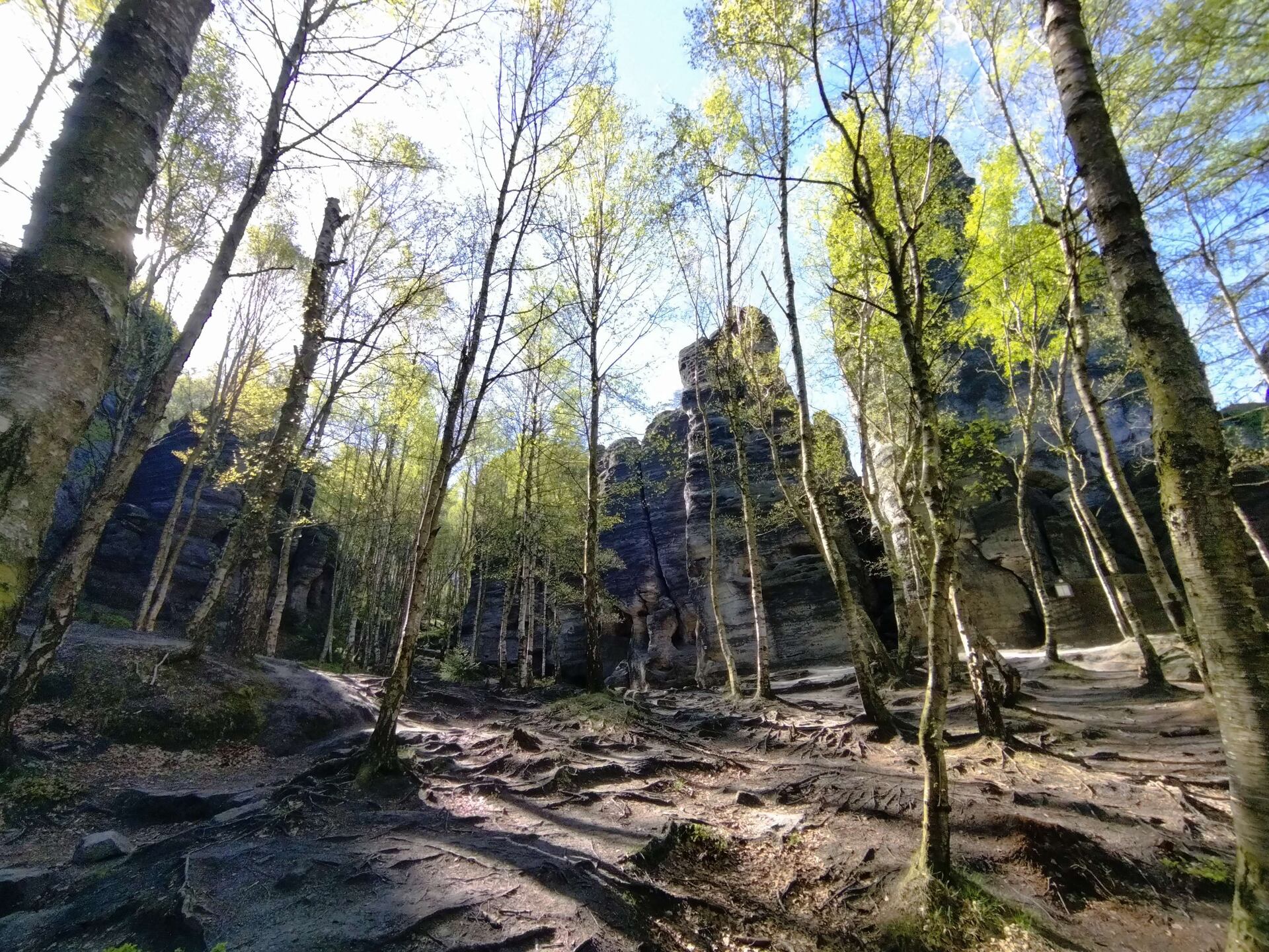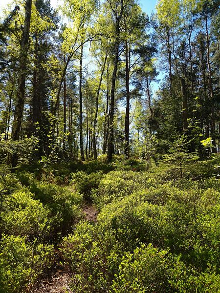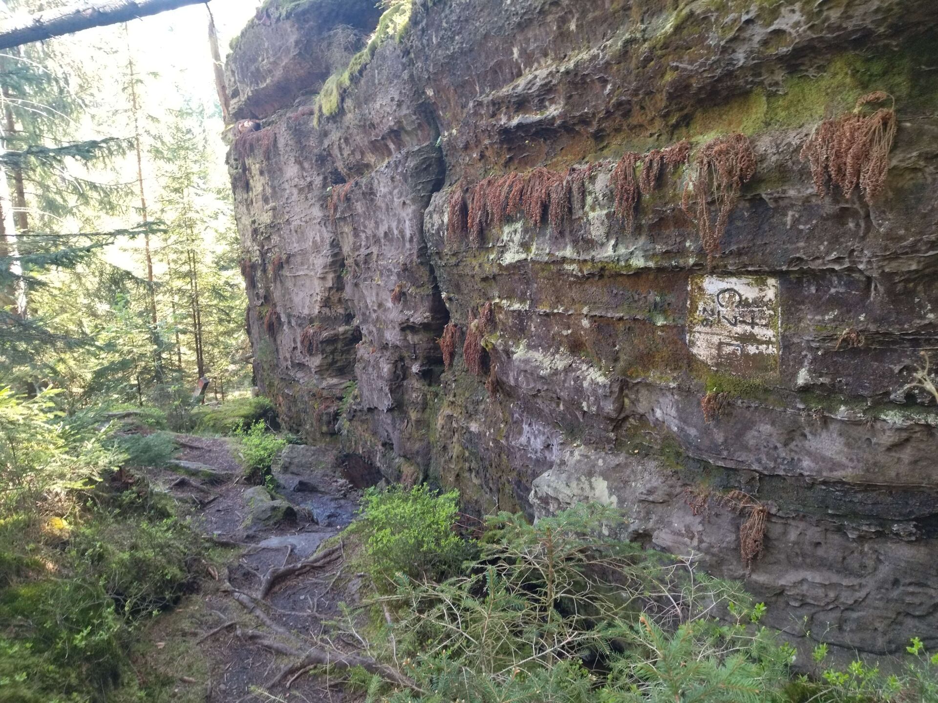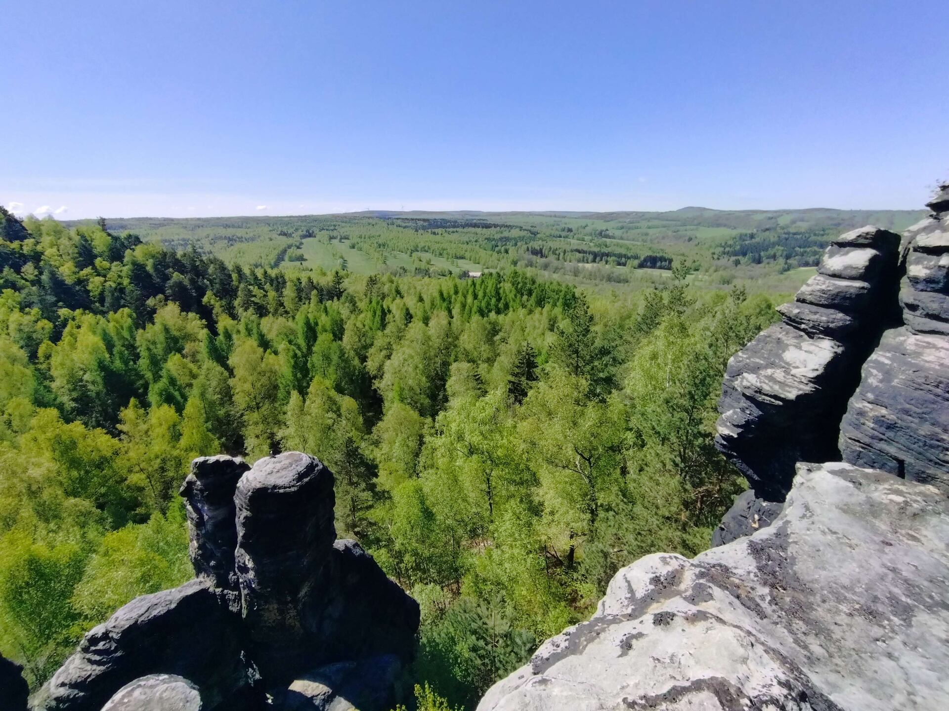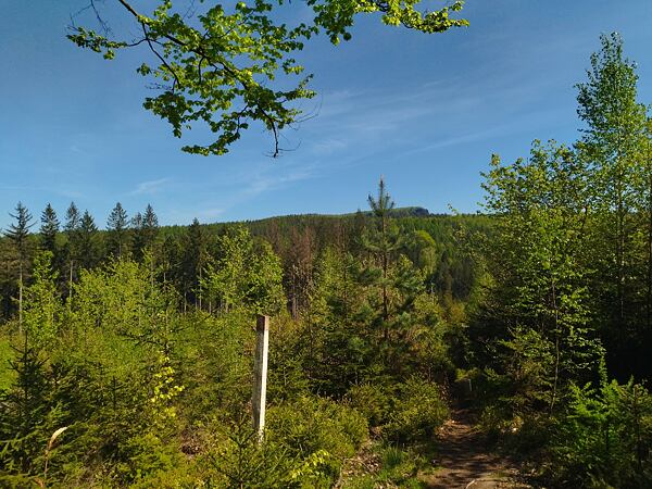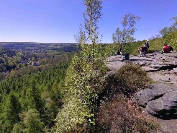 Ráno vyrážím do slunečného dne. Nad kempem procházím skalní oblast Nebeská říše se symbolickým hřbitovem horolezců. Jen malý kousek je to do vyhlášeného skalního města Tiské stěny, ale tam jsem byla loni a teď v sobotu tam bude spousta lidí, tak pokračuji po stezce zpátky do Německa. Nad Rájeckým údolím vede stezka po hraničních kamenech a nabízí vyhlídky na údolí a na vrcholy skalních věží, některé už obsazené horolezci. Po opuštění hranic se stezka klikatí lesem okolo vyhlídky Zeisigstein. Potom je skal méně, zato se prodírám plantážemi borůvčí. Dnes spím v chatě Kamphütte.