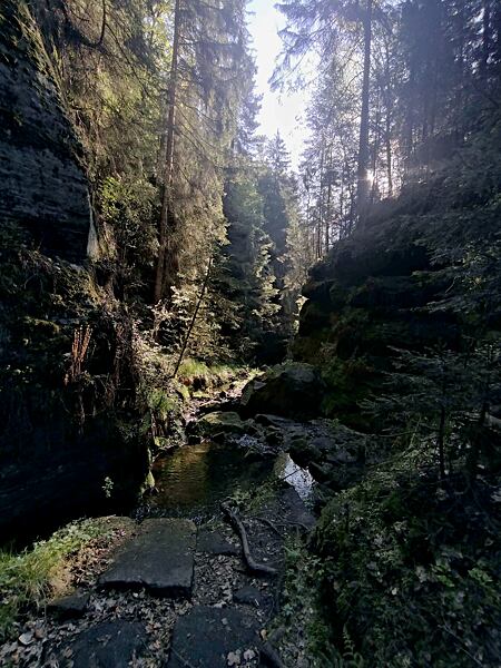 Zbývá už jen sejít zpátky do údolí Labe na vlak. Ani na posledních kilometrech se stezka nevzdává a protahuje mě úzkou pěšinkou malebným údolím Klopotského potoka, i když o kus vedle je pohodlná lesní cesta. Lesní stezku opouštím na hraně labského údolí. Stezka tady zatáčí po proudu Labe na německou zastávku Schöna, já místo toho pokračuji dolů podél Klopotského potoka a proti proudu Labe na zastávku Dolní Žleb.