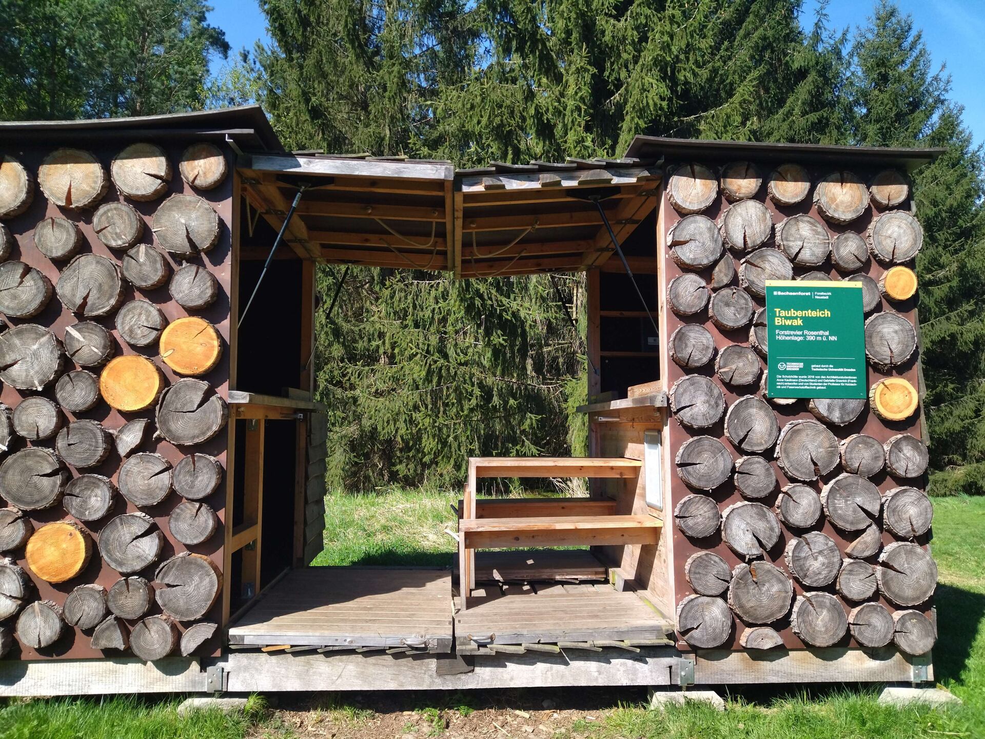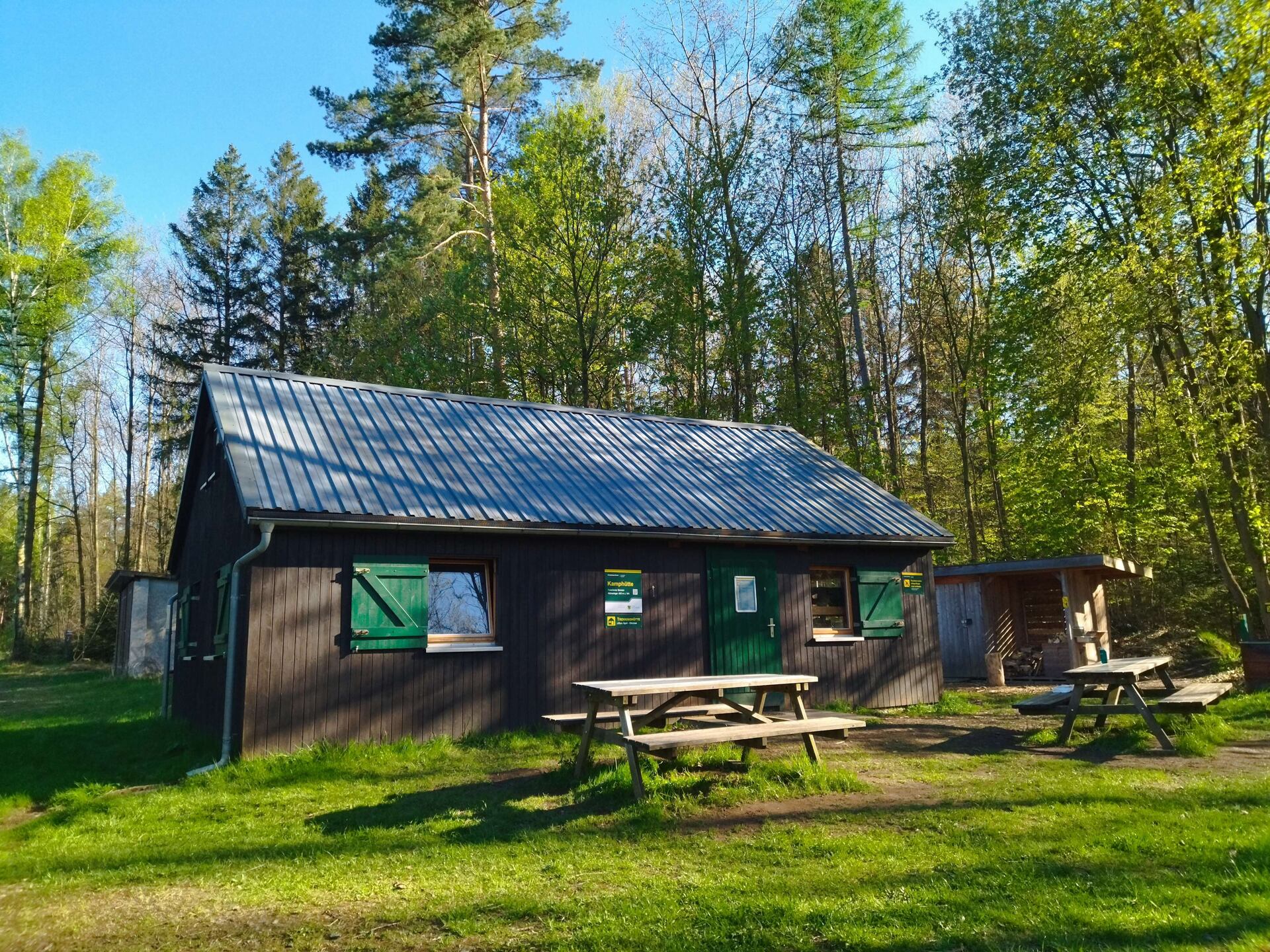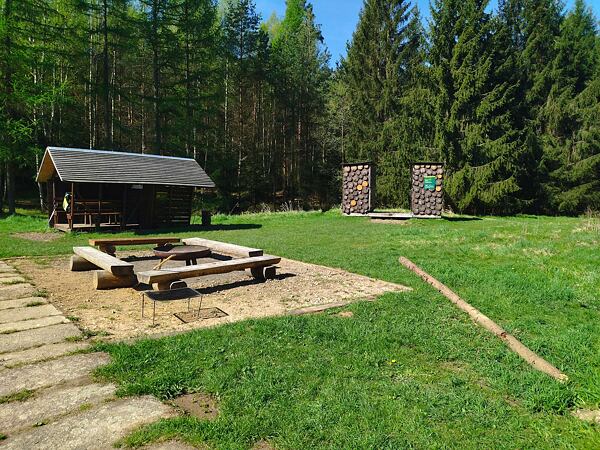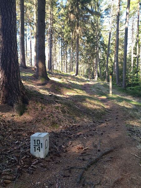 Od Sněžníku se stezka vrací okolo Kristýnina Hrádku zpátky k hranicím. Na tomto úseku je značení sporadické, tak je třeba se řídit hlavně mapou. Podle hranic značení zase je, ale teď už se zabloudit nedá, a tak se bavím počítáním hraničních patníků. Hraniční stezka je chvíli pohodlná pěšina, pak klopýtá přes kořeny nebo pro změnu vede potokem. Nemůžu vynechat zastávku u bivaku vedle rybníka Taubenteich. Je zde velmi zajímavá útulna, vtipně maskovaná jako dvě hromady dřeva.