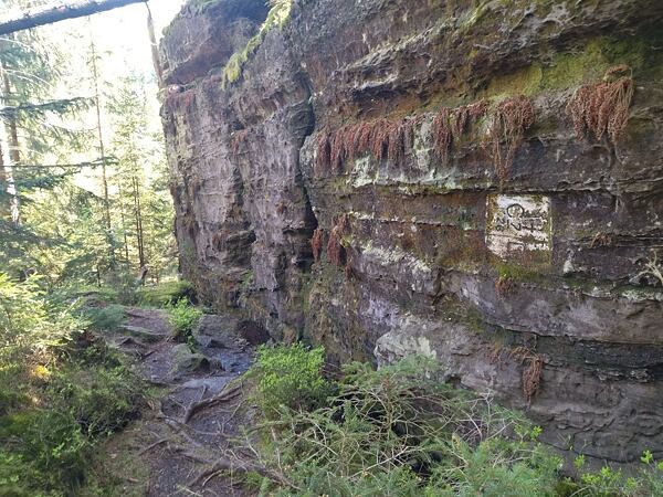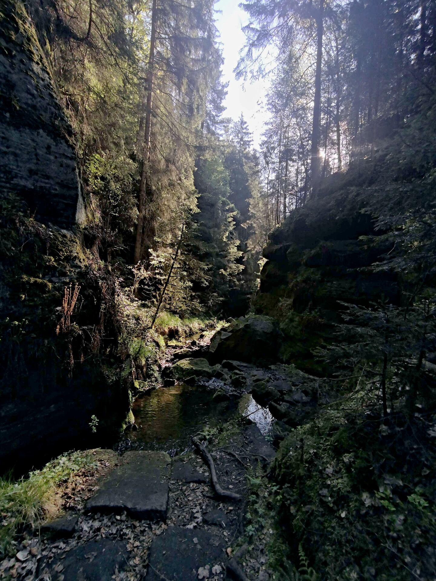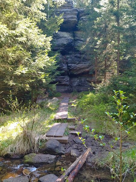 Další pěkné místo je překonání potoka Napajedla/Krippenbach – hluboká rokle s vyhlídkou uprostřed lesa. Dalo by se tu spát pod převisem, přímo pod reliéfem hraničního patníku, hlavou i nohama v jiném státu. Pak už mě čeká jen kolečko po posledních dvou kopcích Kleiner Zschirnstein (472 m) a Großer Zschirnstein (560 m). Z jejich vyhlídek je vidět skoro celá trasa stezky. Poslední noc spím v bivaku Zschirnstein, kde je také pěkná útulna.