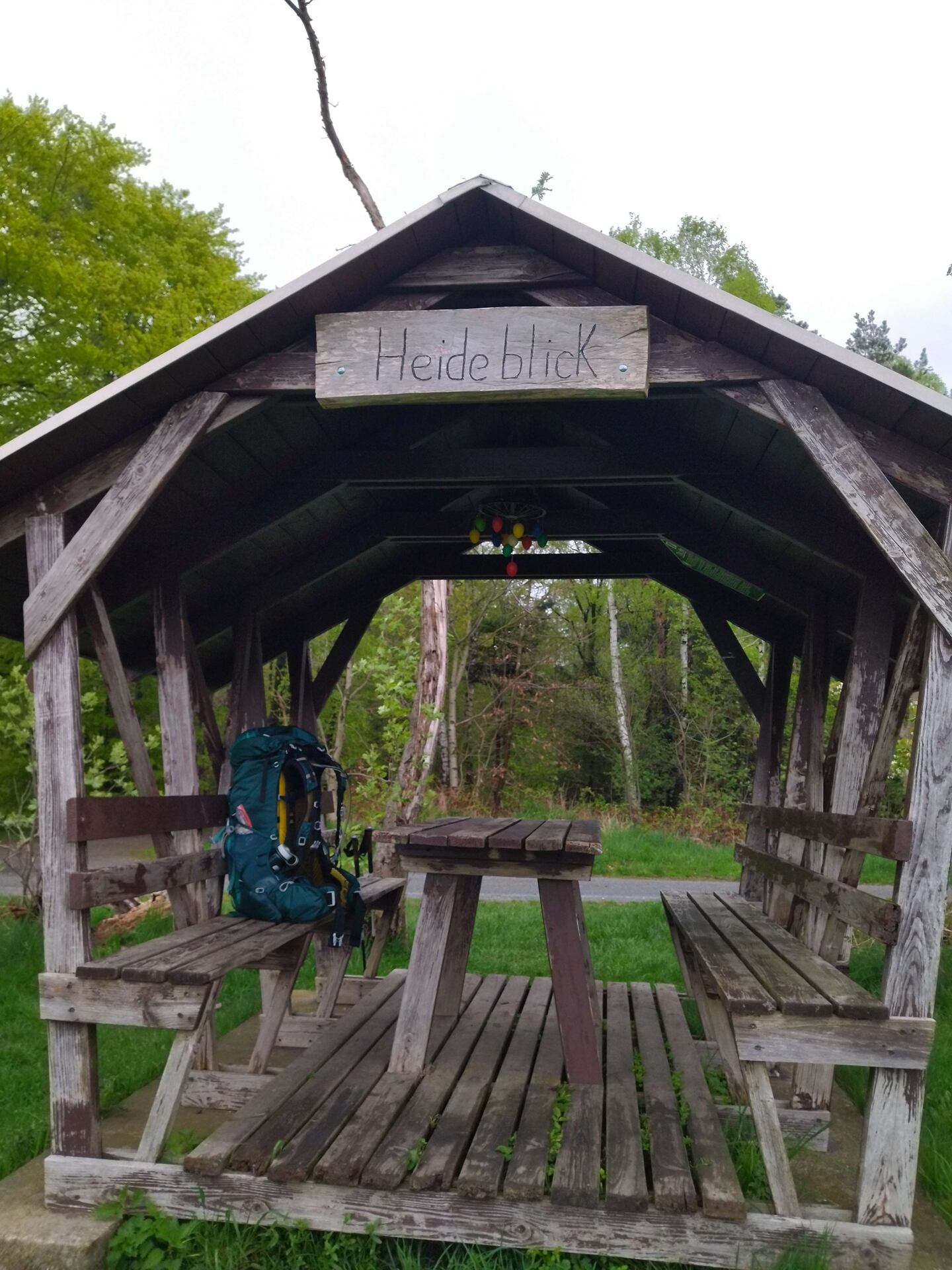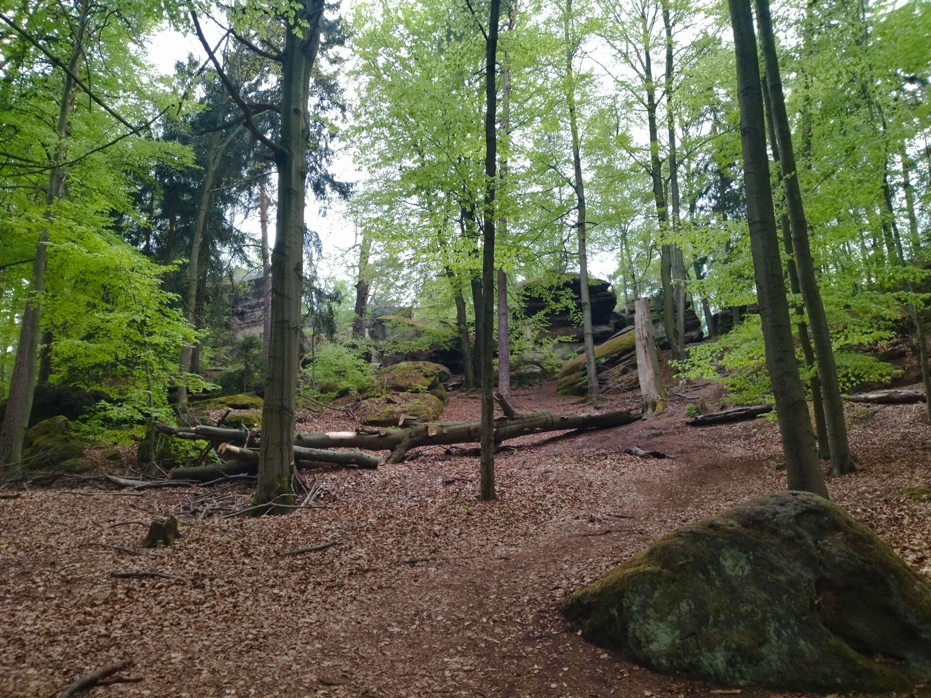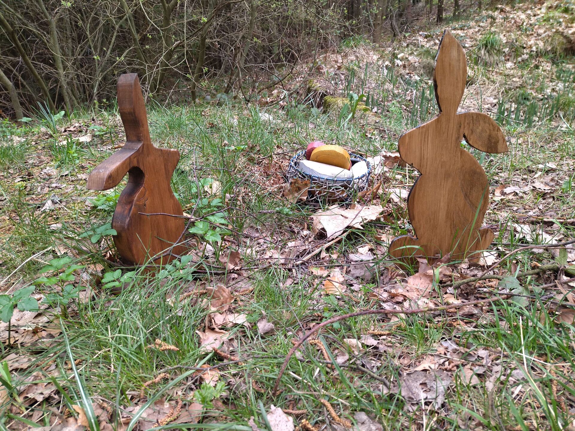 Nejzajímavější místo je dnes Labyrinth, malá skalní skupina v lese. Sama o sobě stojí za cíl výletu, obvláště pro rodiny s dětmi. Pak už jen prší, tak jsou další vyhlídky do mraků. O to víc potěšila velikonoční výzdoba – na jedné lesní křižovatce někdo postavil dva dřevěné zajíčky hlídající ošatku s vejci. Dnešek končím v bivaku Spitzstein. Je tu velká dřevěná útulna, tak nemusím spát pod plachtou.