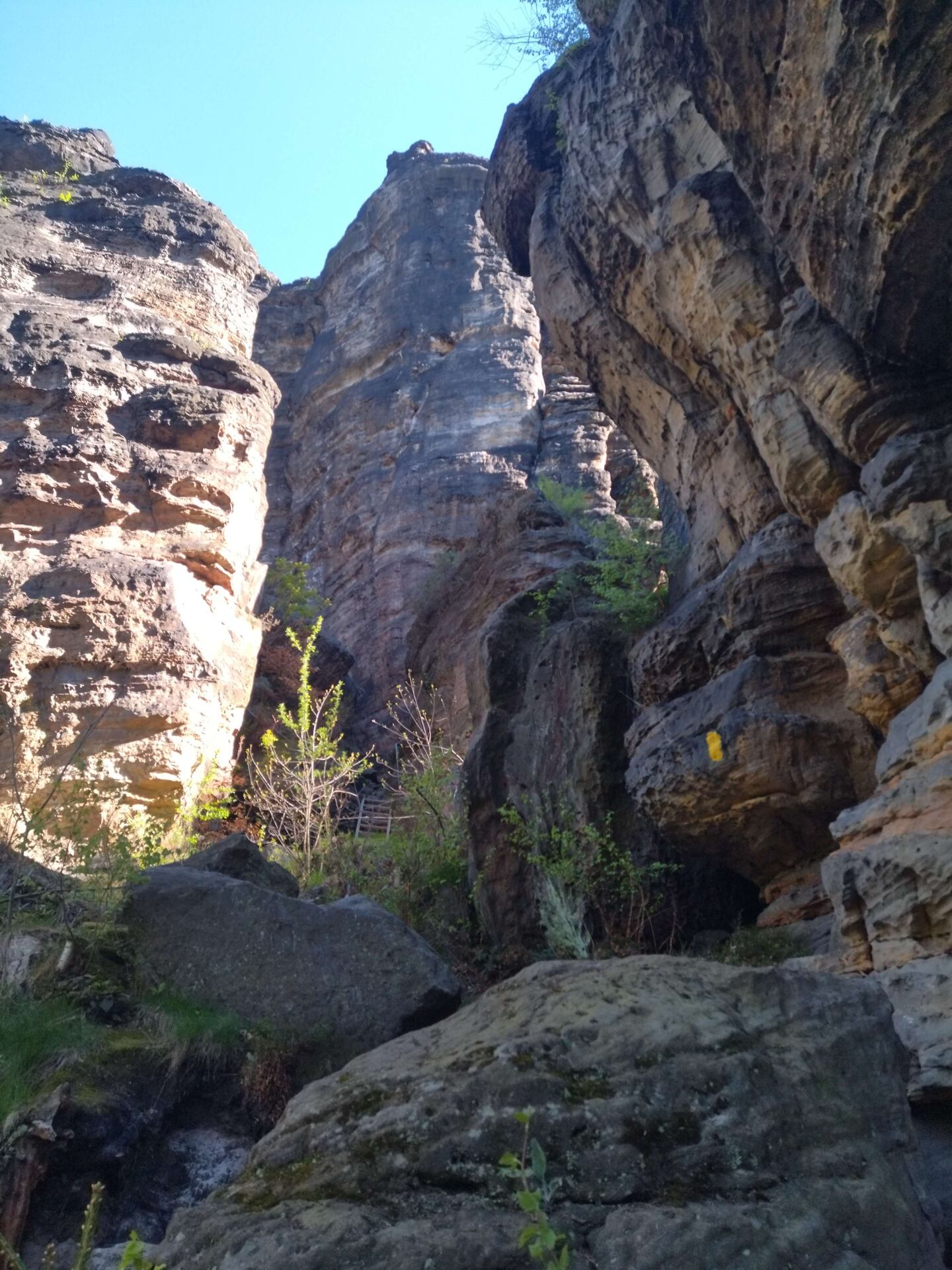 První půlku dne jdu údolím říčky Biela/Ostrovská Bělá. Stezka ovšem neumí jít rovně, takže přecházím z jedné strany údolí na druhou a zpátky, podle toho, kde jsou zrovna skalní vyhlídky a nabírám tak hodně výškových metrů. Je to jeden z nejhezčích úseků stezky se spoustou prolézaček a dobře procvičí i pozornost, protože značení není moc časté a je potřeba dávat pozor, kam zrovna uhýbá. Naštěstí hodně pomáhá aplikace Mapy.com v telefonu.