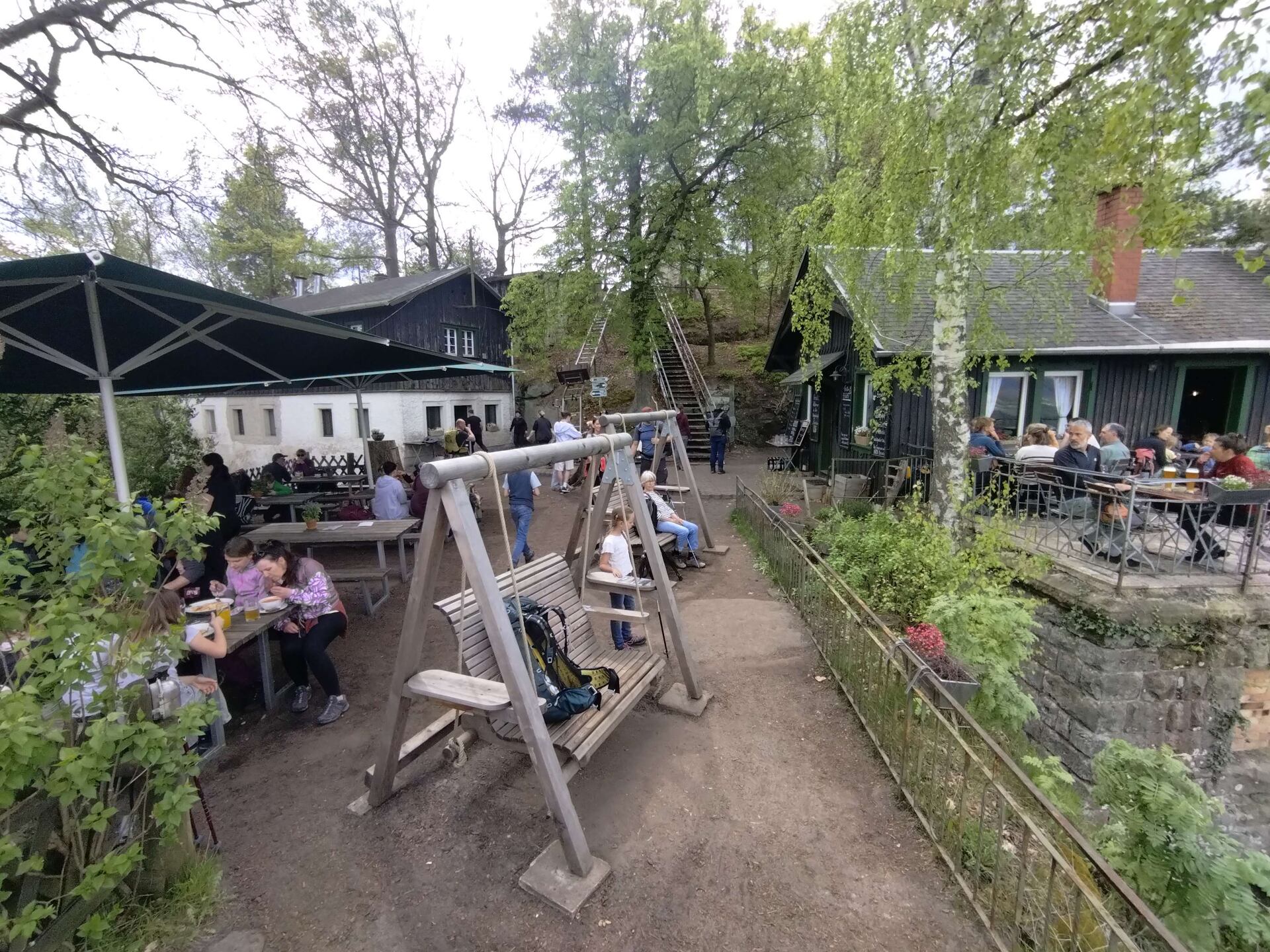 Zato na druhém kopci Papststein (451 m) je přímo narváno. Je tu otevřená restaurace, tak většina lidí zamířila sem. Zrovna tu byla volná jedna houpačka s výhledem, tak jsem neodolala a přes vysokohorskou přirážku na občersvení chvíli poseděla.