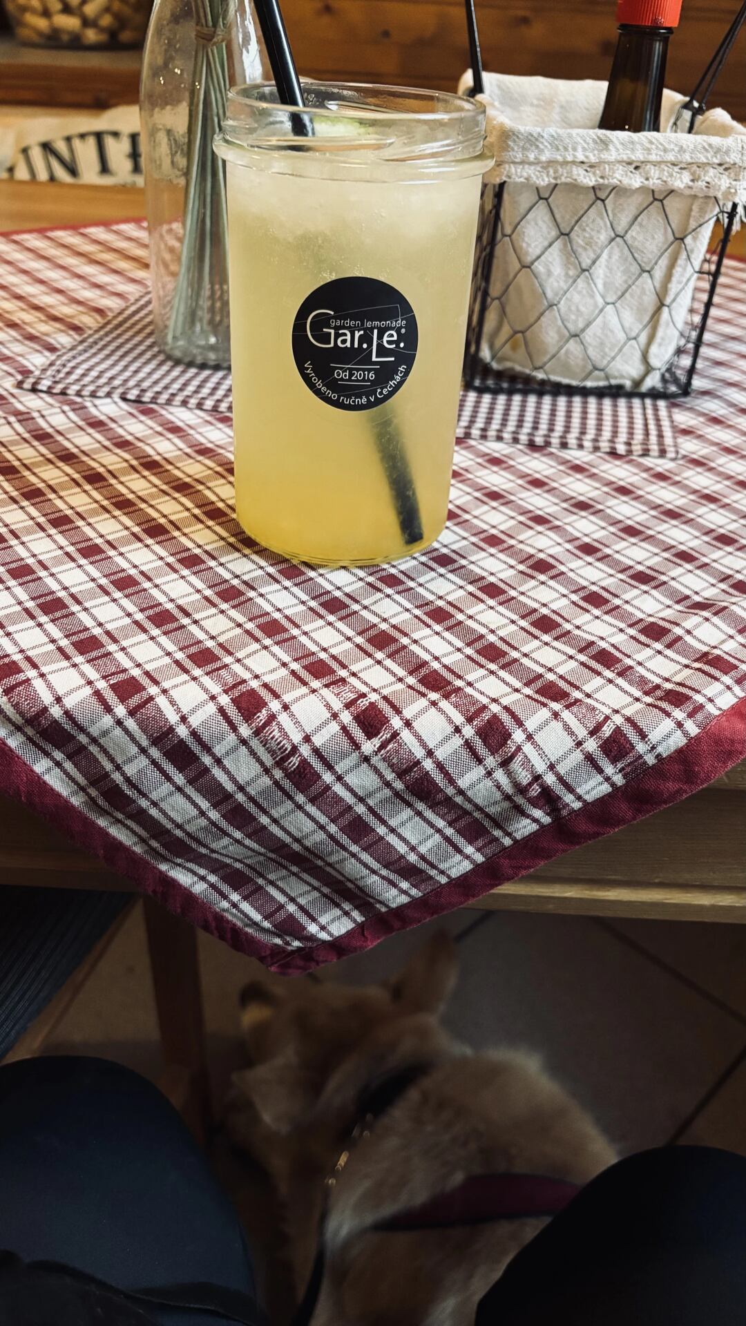To vedro a zátěž v podobě batohu bylo na výkonu opravdu znát. Do kopce jsem myslela že umřu. Izzinka nechápala můj systém výstupu: pár kroků, odfunět a zase pár kroků a zase odfunět... Měla hodně energie a určitě si říkala „Co jí na tom tak trvá? Já už bych teď byla nahoře.“ Tak si zatím popovídala s kravama okolo. Na kopci nás potěšil super Lesní bar a bylo příjemné, obsloužit se chlazenou vodou.