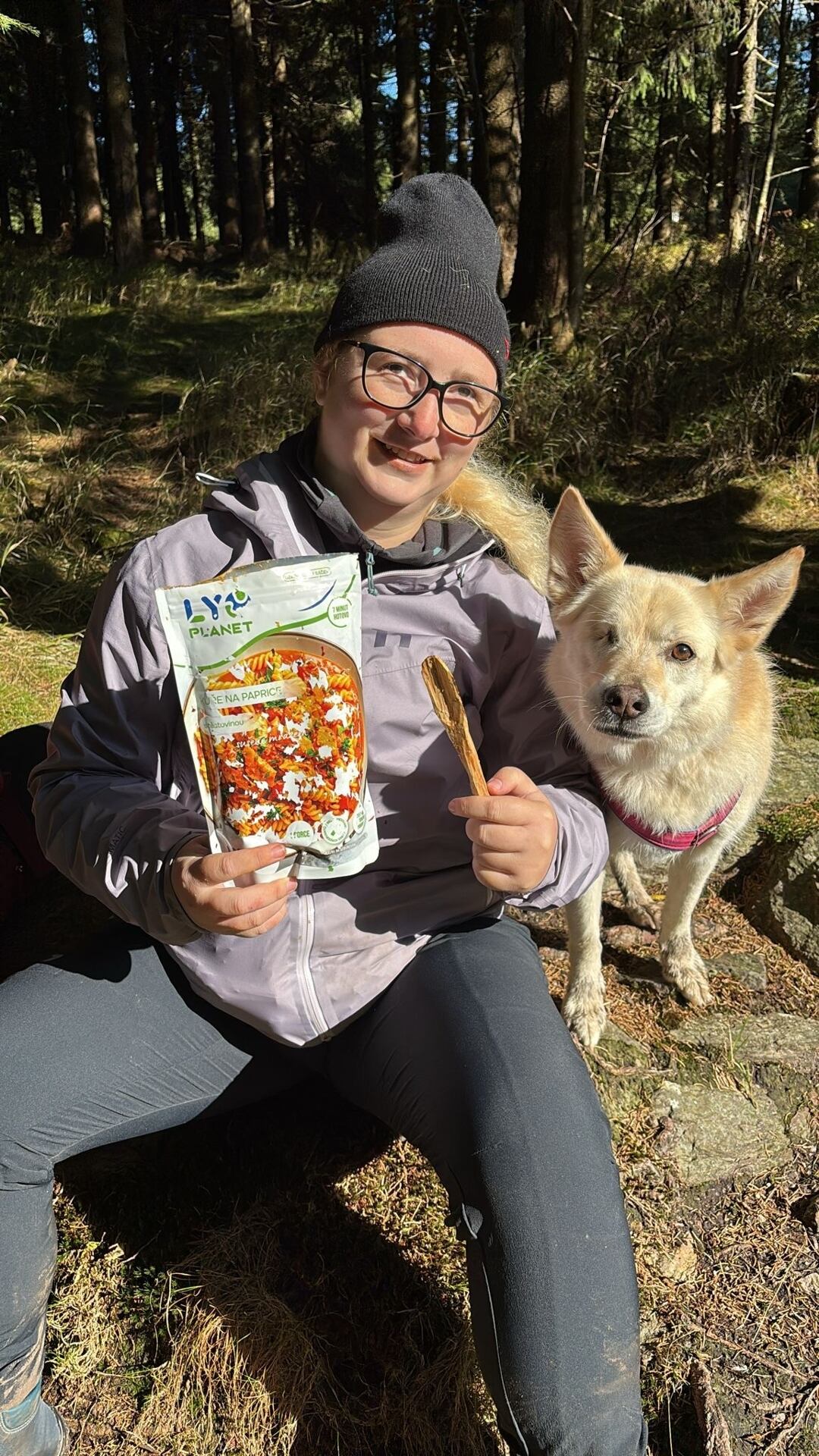 Na dalším kopci jsme si uživali nádherné výhledy, udělali pár cvaků a pokračovali. Těsně před polskými hranicemi už byl čas na jídlo. Izzinka psí proteinovou tyčinku a já s taťkou česnečku s výborným chlebem.