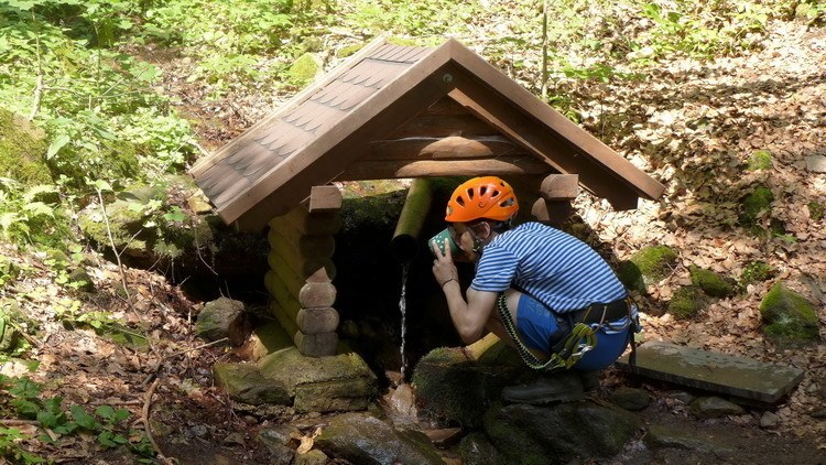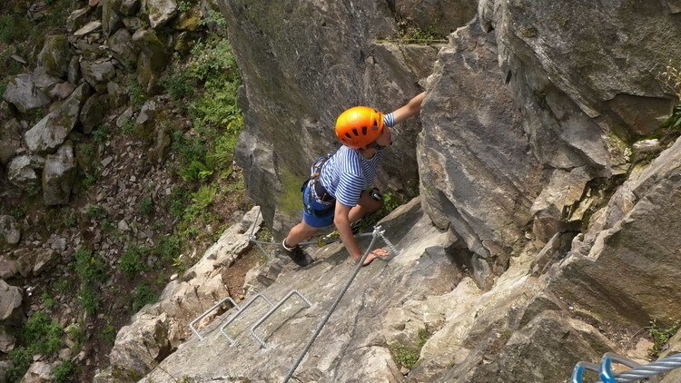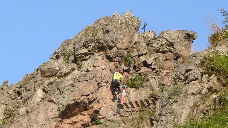 Na Ledové stěně vám budou často tvořit oporu pod nohama kramle a zlatým hřebem cesty je pak desetimetrová lávka mezi skalami. To už je kousek pod vrcholem cesty, a jestliže jste zvyklí z alpských kopců na vrcholový kříž, tak ten mají i ve Víru.