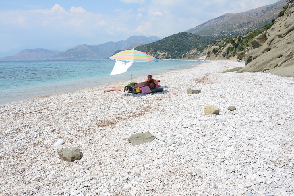 U moře je skvěle. Písčité nebo oblázkové pláže. Útesů málo. A hlavně jen pár Albánců a velmi málo turistů z jiných zemí. Na oblázkových plážích, které jsou průzračnější než zvířené písčité, téměř nikdo. My jsme našli cca 2 km pláže, a když se v poledne zaplnila, bylo na ní šest slunečníků. Jeden mladý cestovatelský pár bivakoval ve stanu pod převisem při ohništi dlouhodobě, což se dá v Evropě snad jen v Albánii.