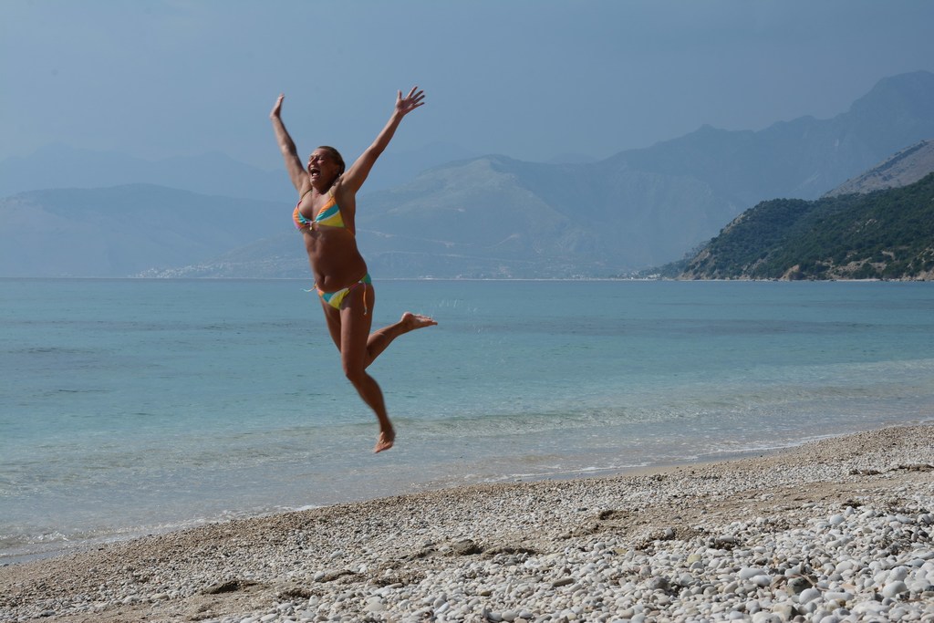 U moře je skvěle. Písčité nebo oblázkové pláže. Útesů málo. A hlavně jen pár Albánců a velmi málo turistů z jiných zemí. Na oblázkových plážích, které jsou průzračnější než zvířené písčité, téměř nikdo. My jsme našli cca 2 km pláže, a když se v poledne zaplnila, bylo na ní šest slunečníků. Jeden mladý cestovatelský pár bivakoval ve stanu pod převisem při ohništi dlouhodobě, což se dá v Evropě snad jen v Albánii.