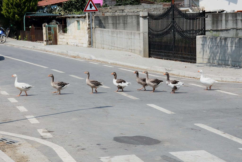 Spěch všech albánských řidičů je paradoxní z hlediska toho, co vše můžete na silnicích za kteroukoli zatáčkou potkat. My jsme měli tu čest, odhánět z předkapoty koně, osla (se spřežením), krávy, stovky koz a ovcí, hejno hus, ještěrky i sprintující želvu.