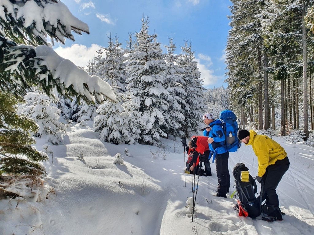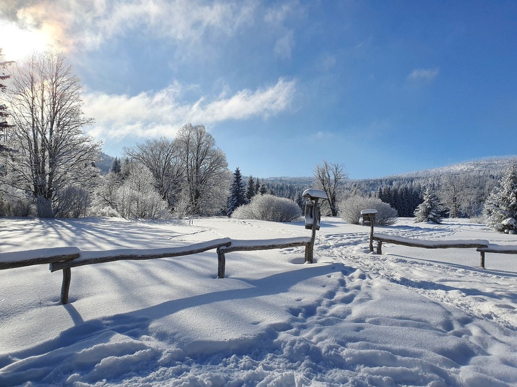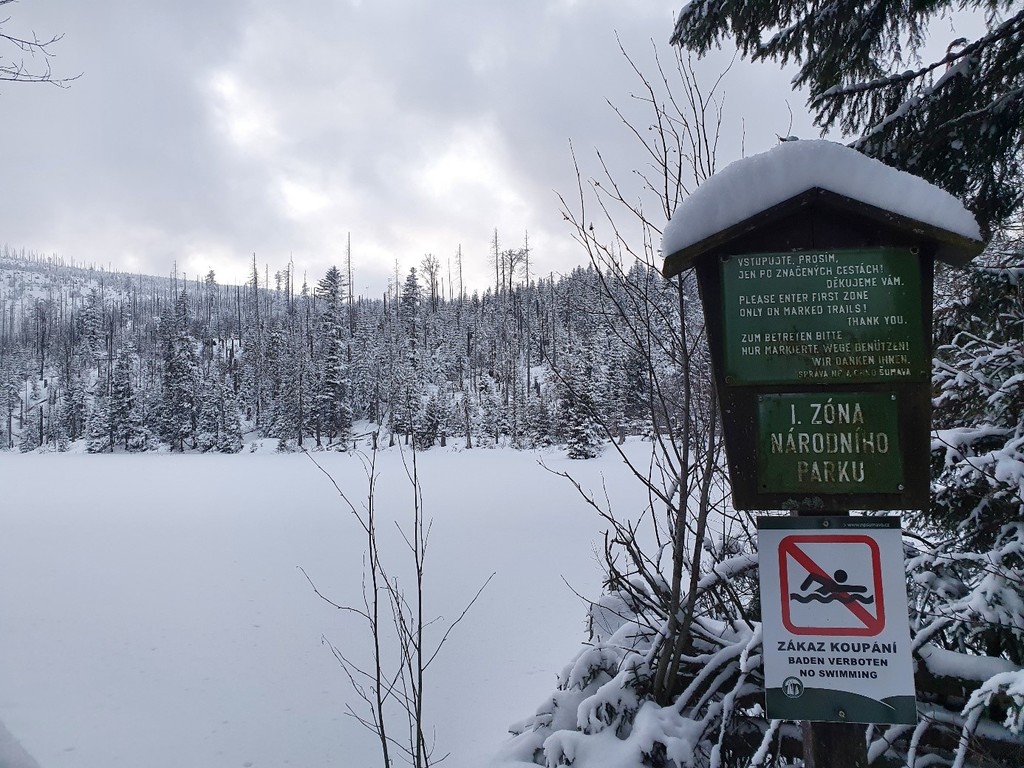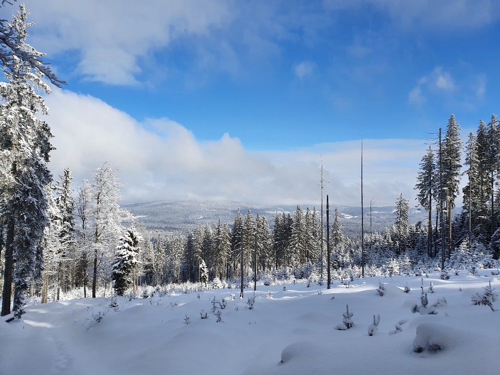 Ráno odjíždíme směr Prášily. Cesta rychle plyne, slunce začíná prosvítat a venkovní teplota se zastavuje na -11°C. Kolem poledne stojíme na parkovišti v Prášilech. Rychle pobalit, zaplatit parkovné a honem honem vyrazit do té zimní pohádky. Dnešní cíl je nouzové nocoviště Hůrka.