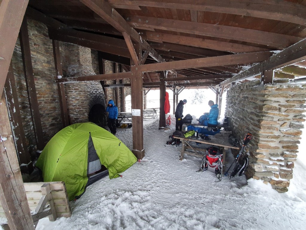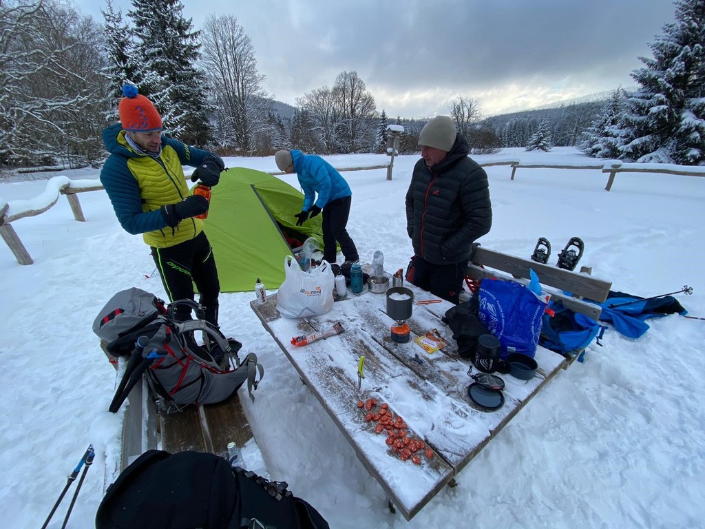 Původní plán byl stanovat opět na nouzovém nocovišti, ale kvůli mocné vrstvě sněhu volíme rozbalit tábor přímo pod přístřeškem u rozhledny. Vybalujeme hydratované boloňské špagety, polozmrzlou klobásu a vlažný čaj. Bon appetit! Postáváme u ohně, vstřebáváme dnešní den a teplý čaj doplníme kalíškem něčeho ostřejšího.