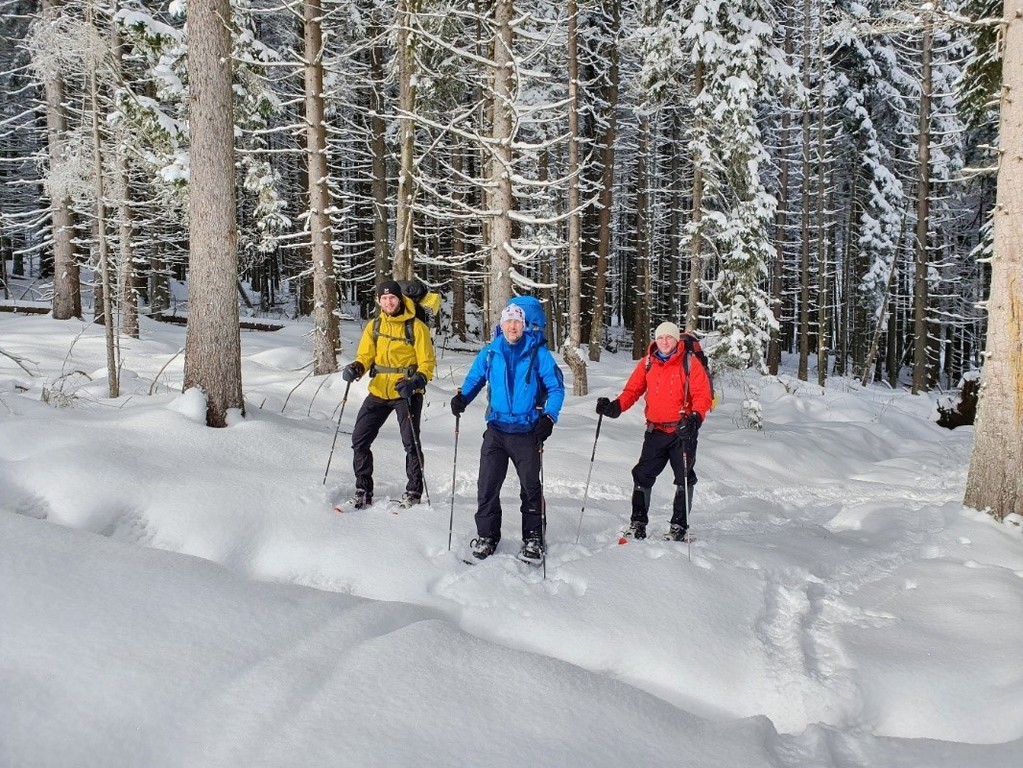 Na rozcestí u Vysokých lávek točíme prudkou levou, a dále pokračujeme středem upravené běžkařské stopy na další rozcestí kousek pod Hůrku. Na nocoviště to máme už jen kousek. Nazouváme sněžnice a volíme přímý směr přes prašanem pokrytou louku. Paráda. Má to své kouzlo. Všichni si to náramně užíváme a shodujeme se, že pokud máme sněžnice na nohou, prošlápneme cokoliv.