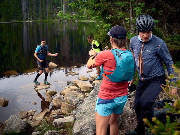 Jelikož nám z nebe padá vodní štěstí, tak raději běžíme dál. Ještě se domlouváme, kde se znovu potkáme s naším proviant týmem, co nám má připravit za dobroty a zase stoupáme. Nyní k Prášilskému jezeru, kde je atmosféra úžasná.