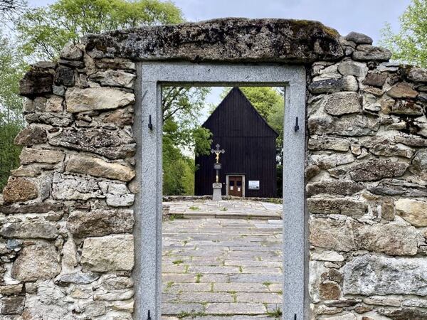 Stoupání hned od parkoviště zahřívá naše těla a taky ubírá dechu. Aspoň, kdyby nebylo toho asfaltu. To už jsme na bývalé Hůrce u kostelíku, který v lese vypadá poněkud nepatřičně, až tajemně. Kdysi tady byla vesnice. Dnes kostelík a krásné nouzové nocležiště.