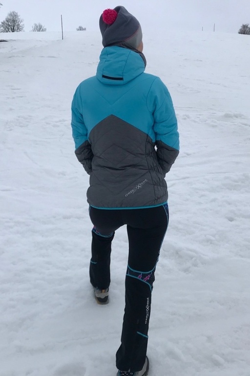 Už na ramínku mě upoutala skvělým designem, nádhernou barevnou kombinací. Protože mám od Crazy Idea už skitouringové kalhoty a zimní sukni, tak mi zateplovačka Electra vytvořila trojičku do zimních hor, která k sobě pěkně pasuje. Jakmile se bundy dotknete, pohladí vás jemná látka, až vás to zaskočí a v první chvíli zaváháte, jestli je bunda mechanicky odolná. Ale bez obav.
