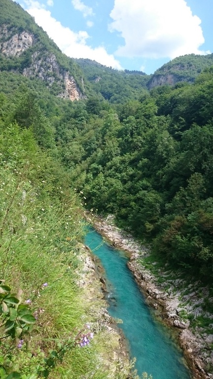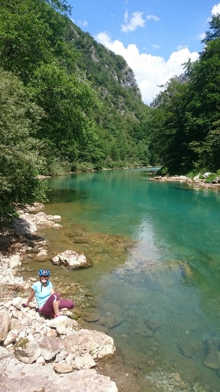 My jsme si to na kolech sjeli k mostu nad řekou a potom pokračovali proti proudu. Krajina kolem řeky Tary je nádherná, chvíli jsme ještě měli v zádech most.
