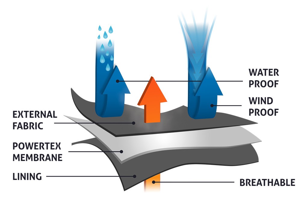 Materiál Powertex 3L nabízí skvělé hodnoty nepromokavosti - vodní sloupec 20 000 mm a prodyšnosti MVTR 30 000 g/m²/24h.