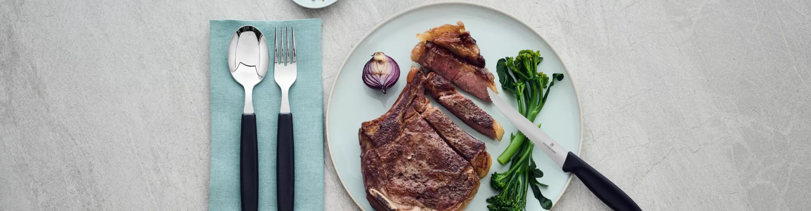 Steakový nůž Victorinox vám jistě usnadní krájení steaku, ale také umožní strávit krásný večer plný dobré konverzace s přáteli. A to proto, že jeho ergonomická rukojeť se ztrácí v ruce a mimořádně ostrá čepel řeže bez námahy, takže pozornost zůstává soustředěna na menu a okamžik.