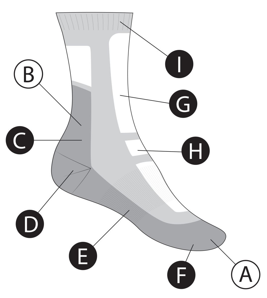 C – Zesílená pata a špička pro odolnost a pevnost.